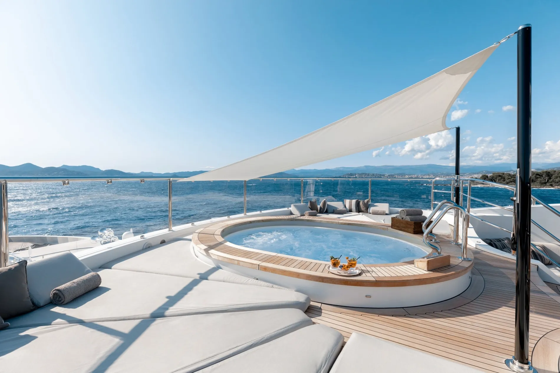 Forward sits a raised Jacuzzi surrounded by sun pads; amidships, a sheltered dining area can be enclosed for protection; while the aft section remains open and can also serve as a touch-and-go helipad.