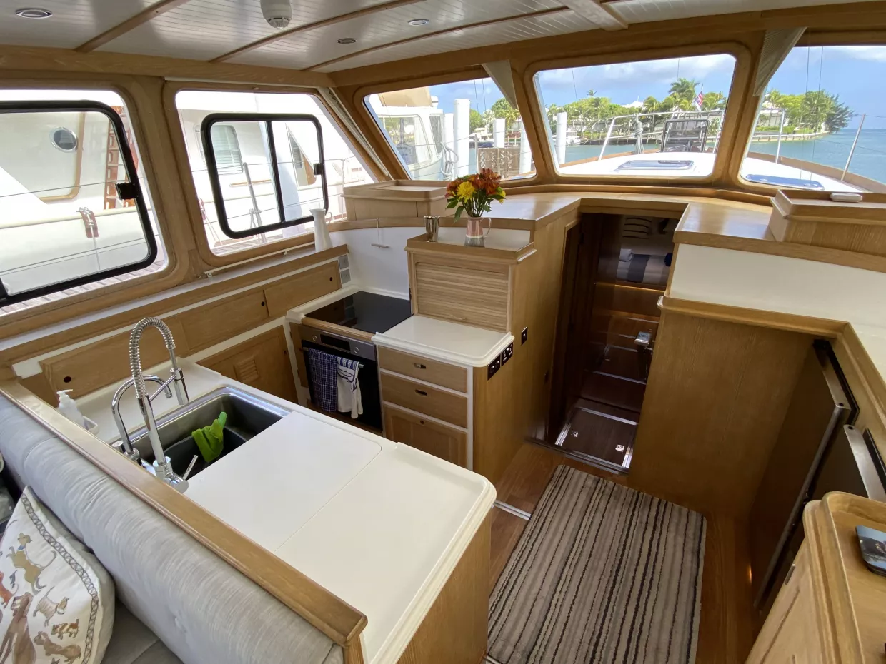 The galley is open and social, fitted with Bosch appliances.