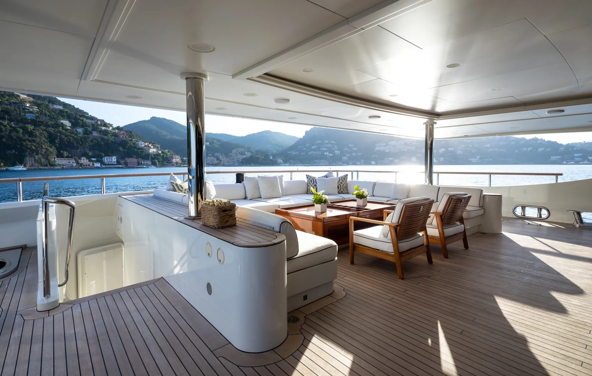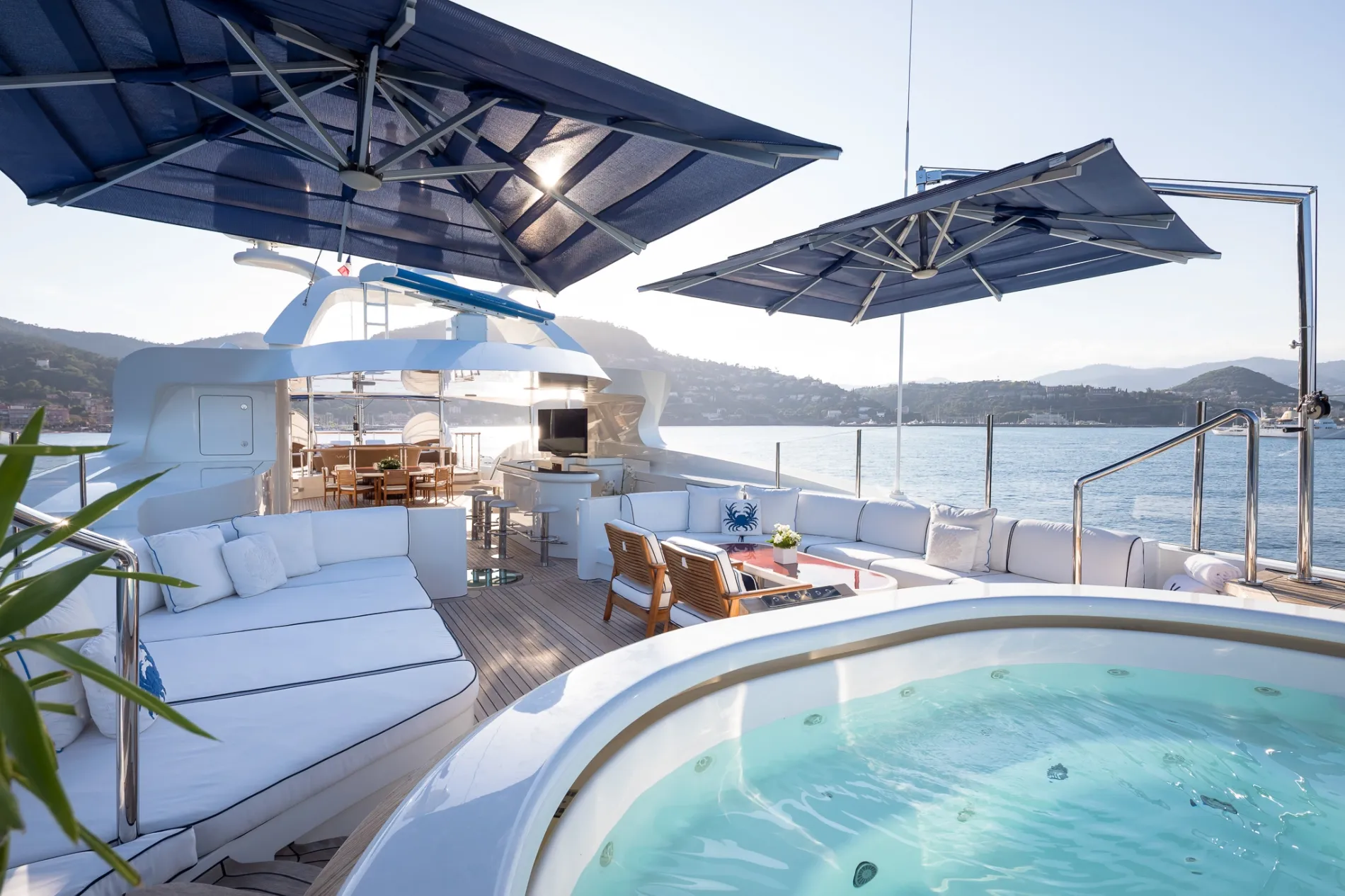 Ample space with sunpads, a bar, plug-and-play AV, and outdoor cinema—ideal for entertaining or unwinding at sea.