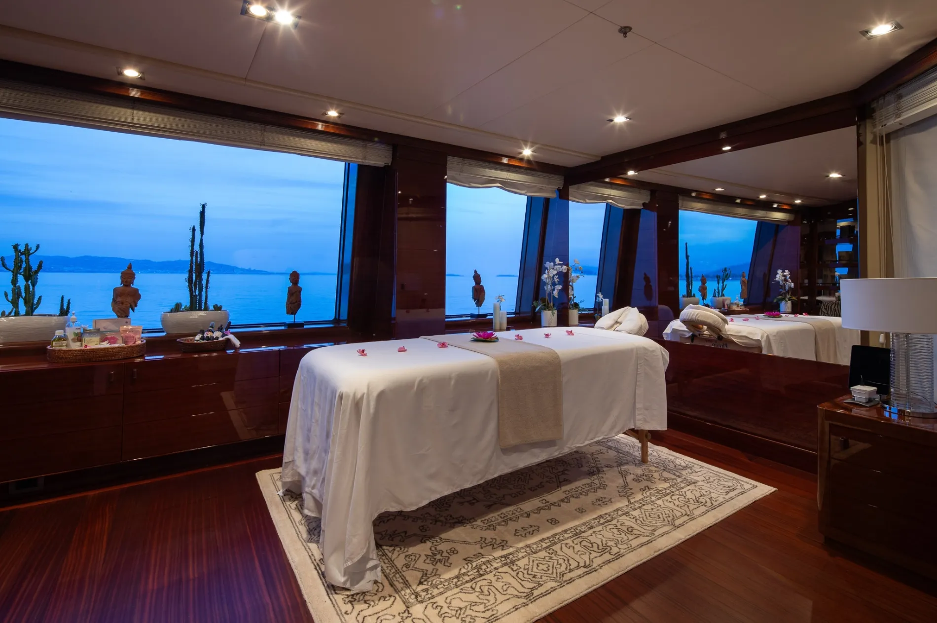A VIP suite on the upper deck featuring large windows and an en-suite with a steam room/hammam.