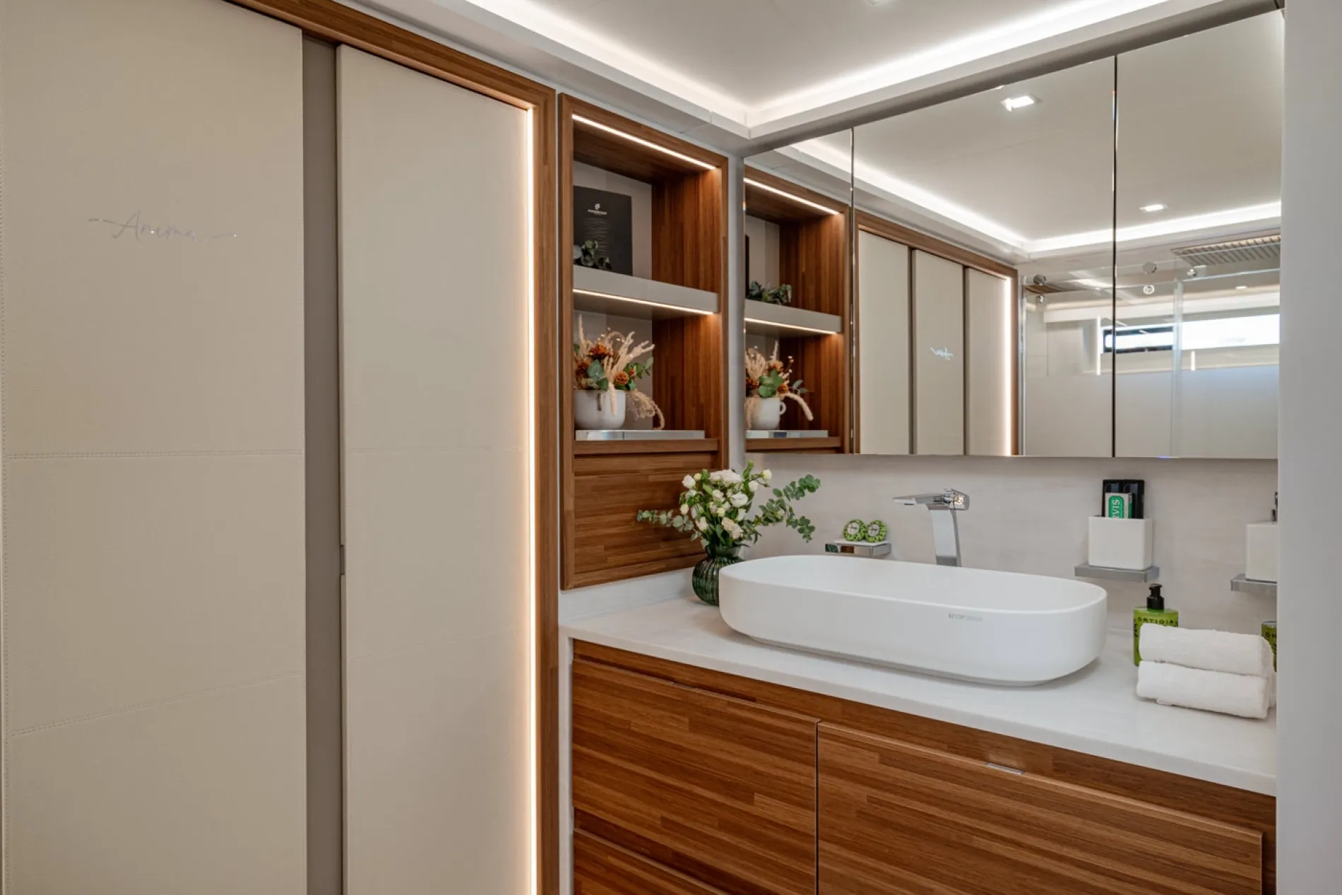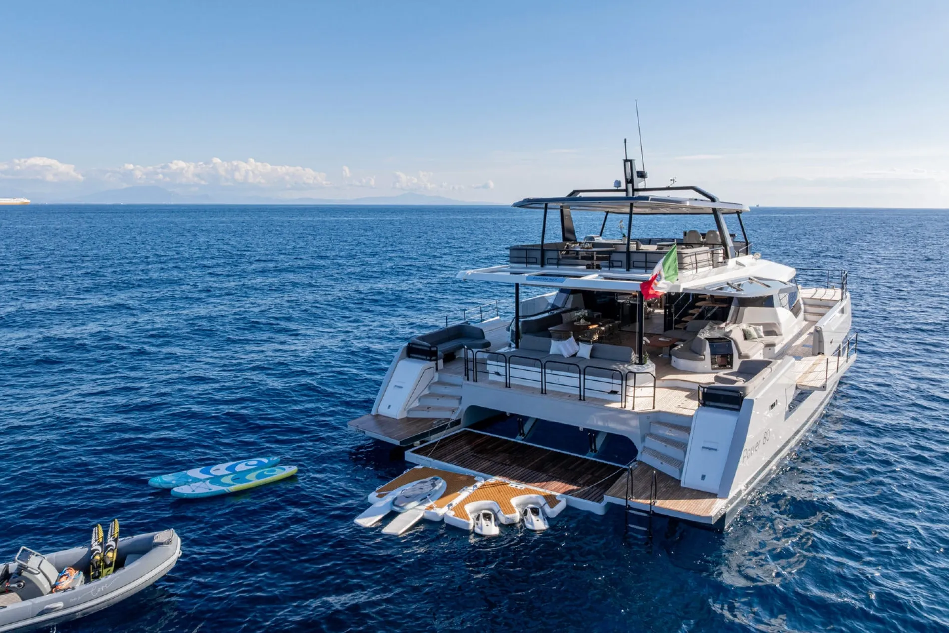 Once the tender is launched, the aft platform drops to create a large waterfront terrace, then lowers further to water level for swimming and sea access.
