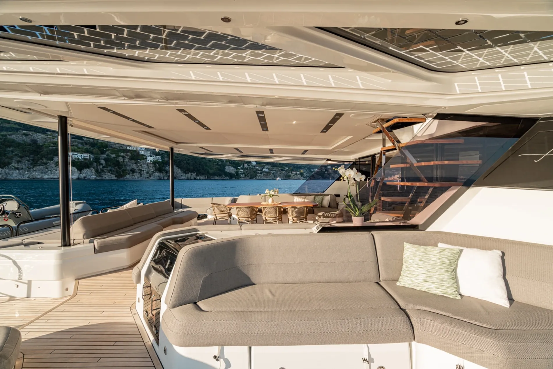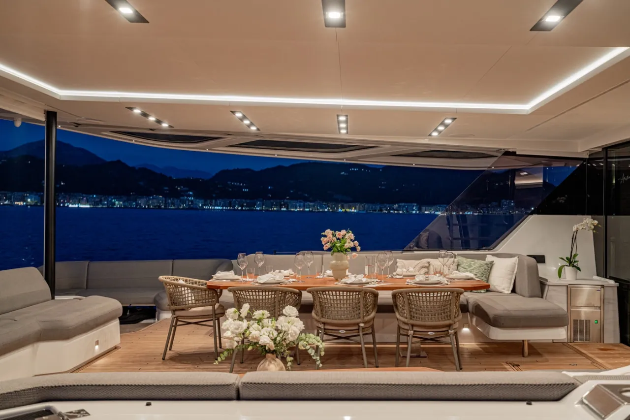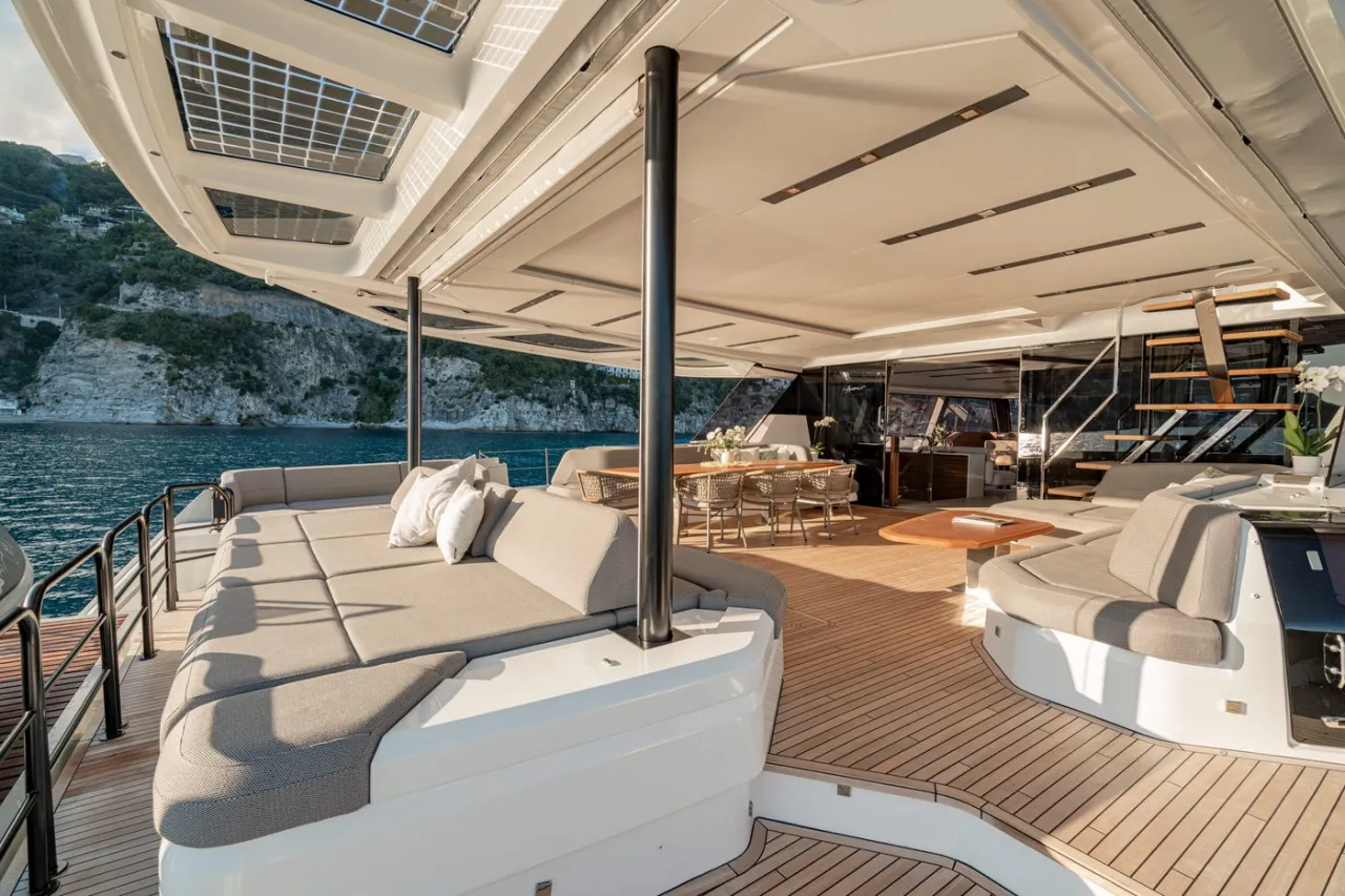 A shaded al fresco dining space on the main deck offers a more sheltered setting for lunch or dinner.