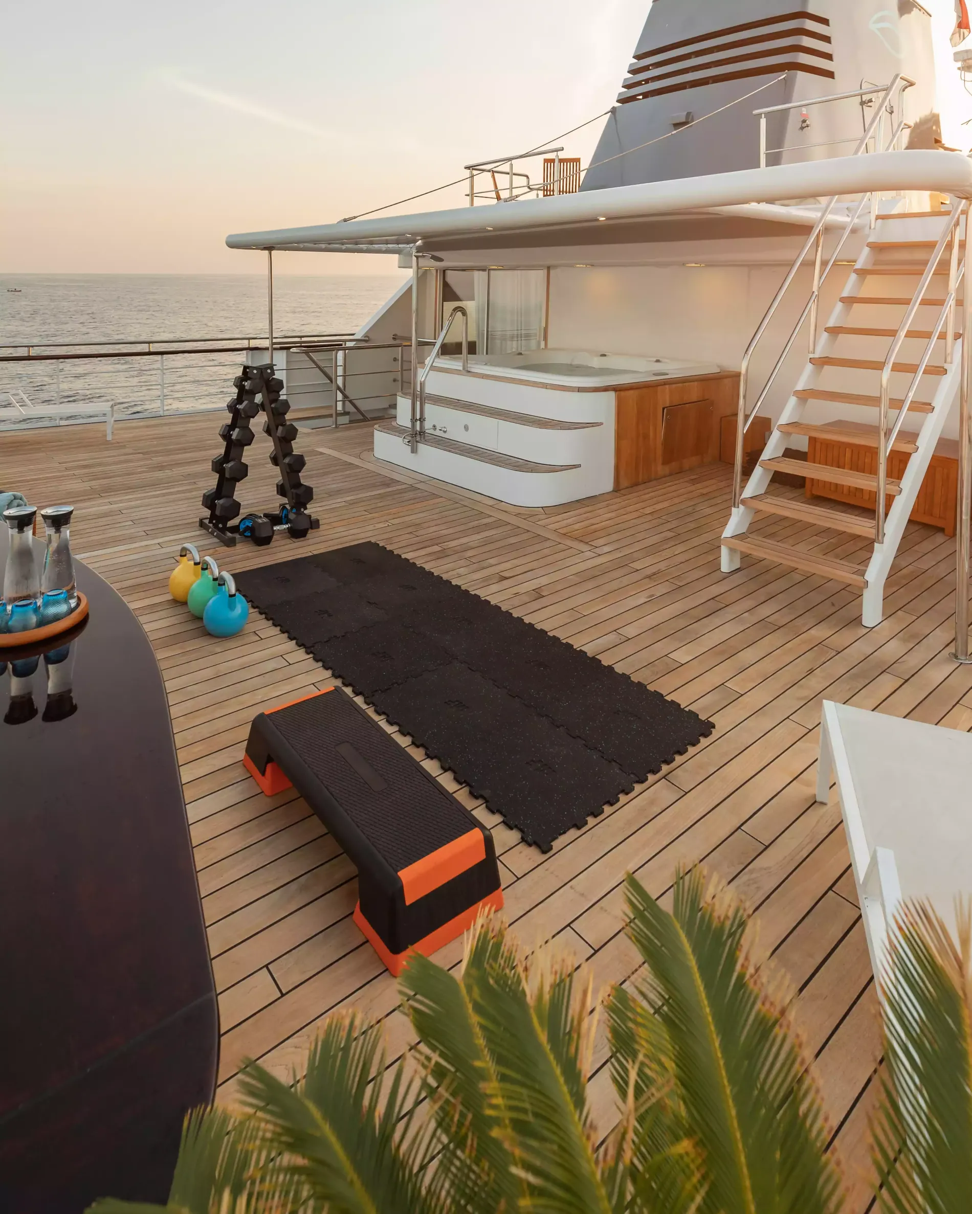 A sociable deck with an open-air Jacuzzi, plush daybeds, and an outdoor fitness area for workouts with a view.