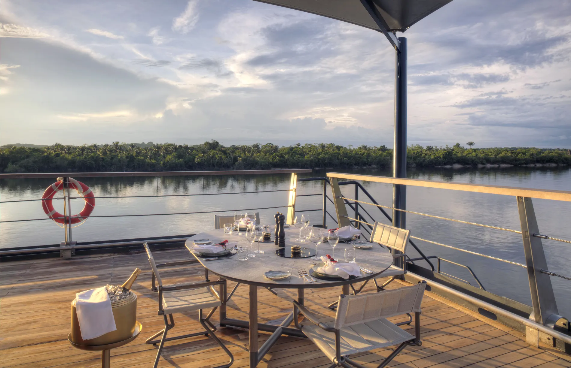 Inviting bow and stern lounges offer shaded comfort for reading, relaxing, or quiet river watching.