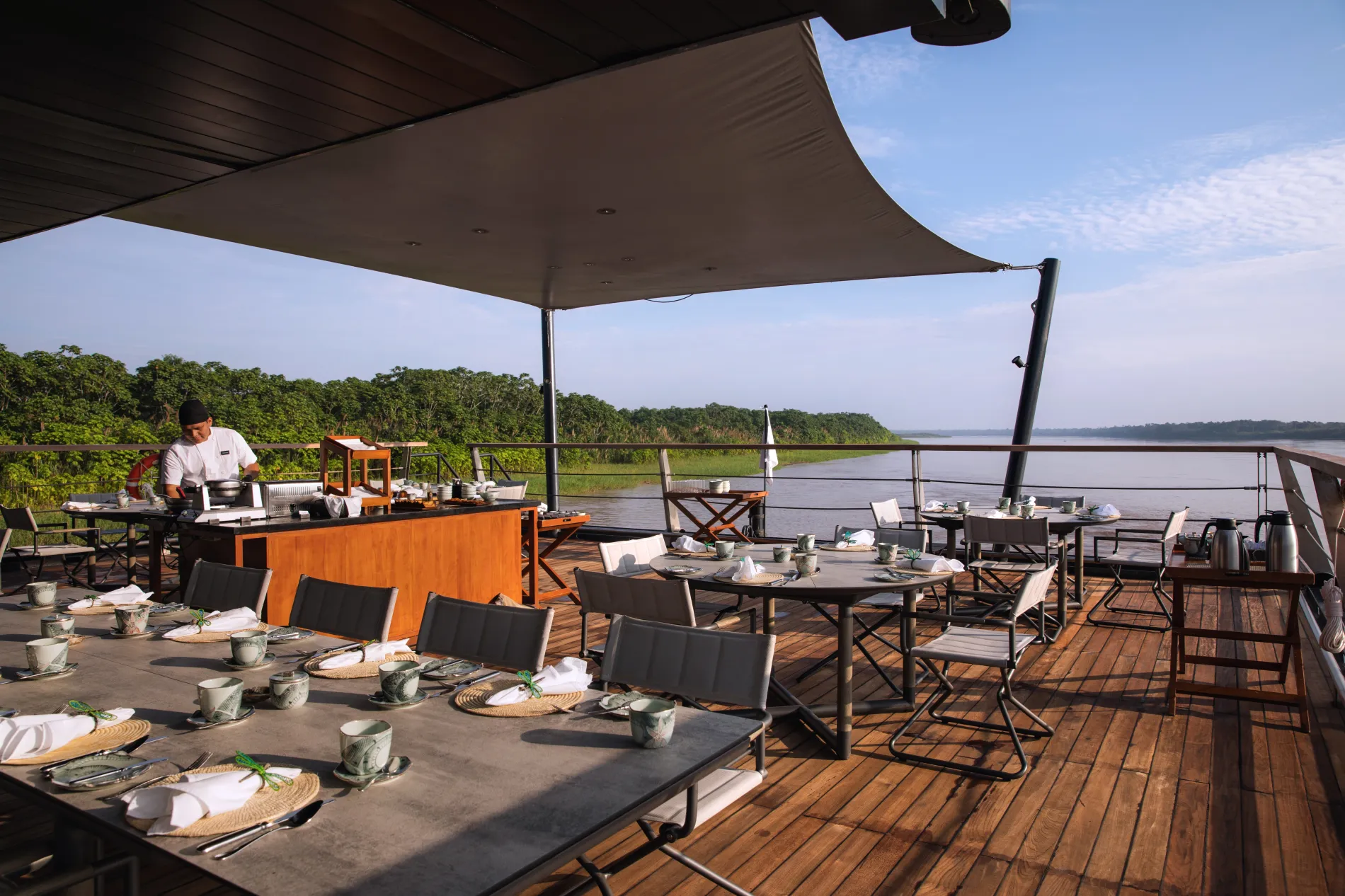 Set against sweeping river views, the dining room is the stage for Chef Pedro’s farm-to-table menus inspired by the Amazon.