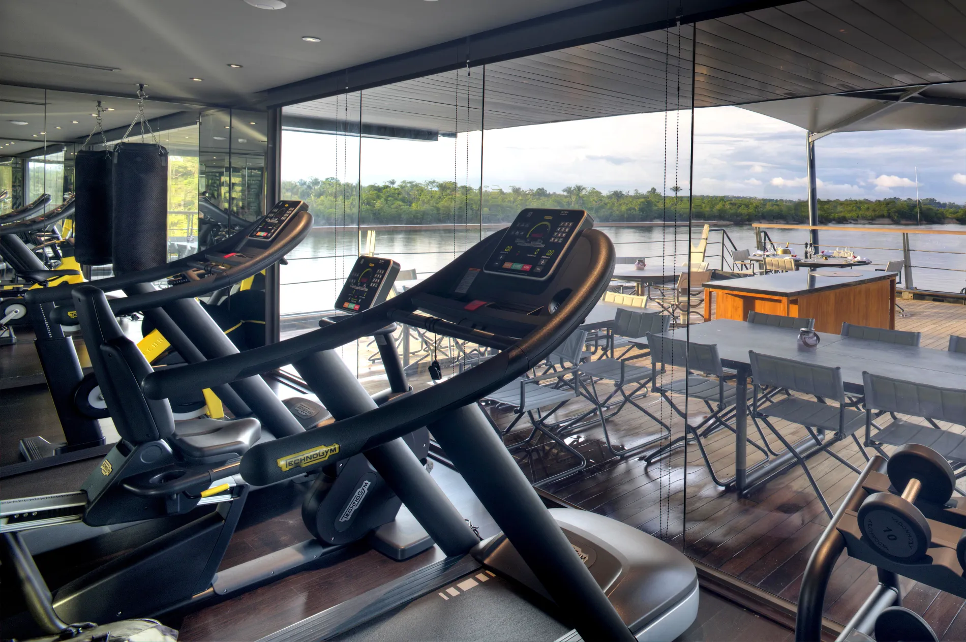 The gym features treadmills, weights, and a stationary bike positioned by floor-to-ceiling windows, so every workout is surrounded by rainforest views.