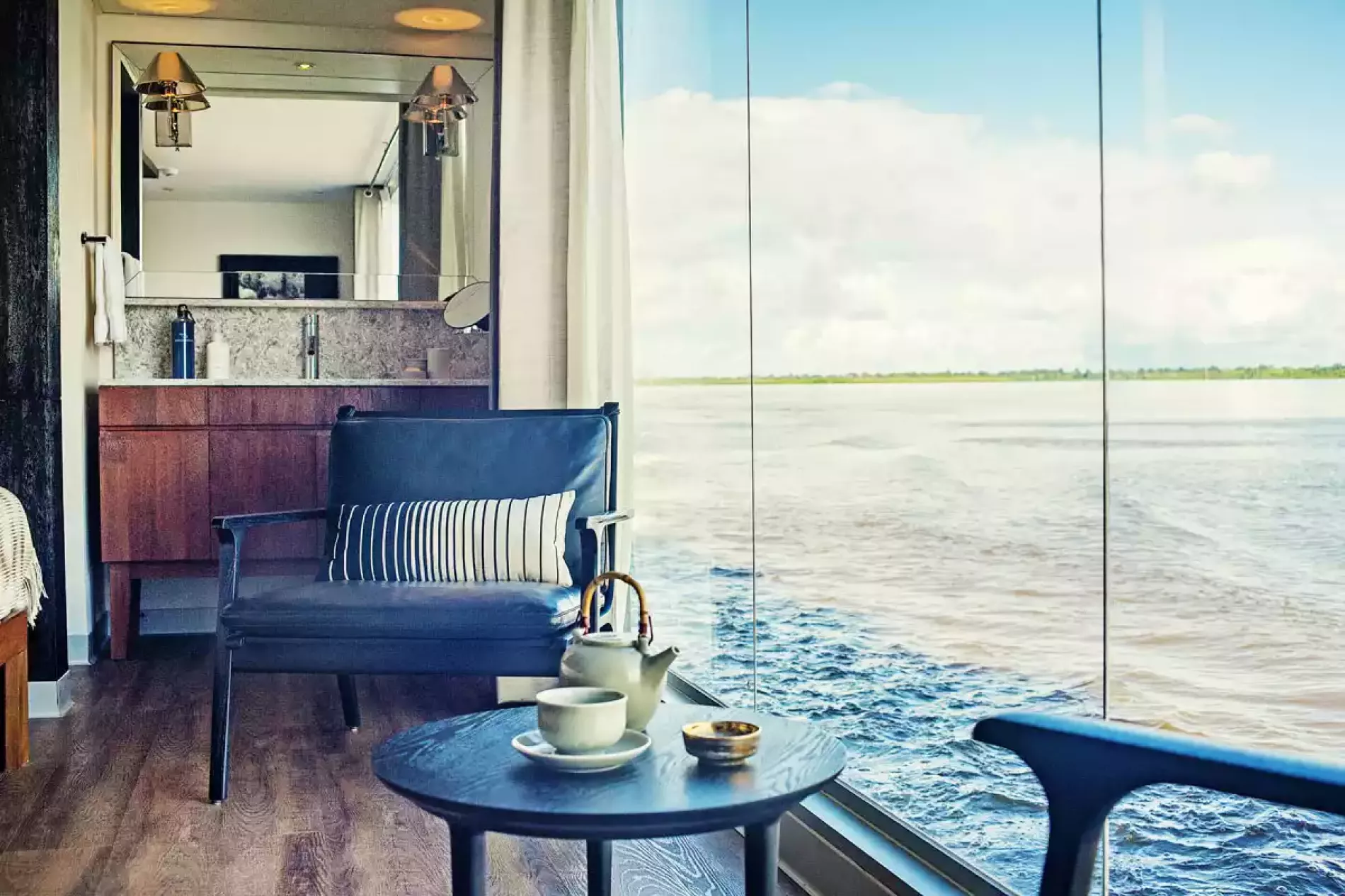 With 16 suites accommodating up to 32 guests, the Aria Amazon offers an intimate experience to be shared. Each river-facing suite features local hardwoods, high-thread-count Peruvian cotton linens, a luxurious bathroom, and a private lounge.