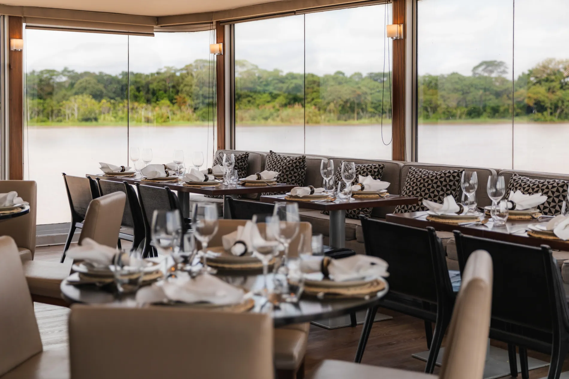 Located on the first deck, this five-star dining space pairs exceptional local cuisine with breathtaking views of the Amazon.