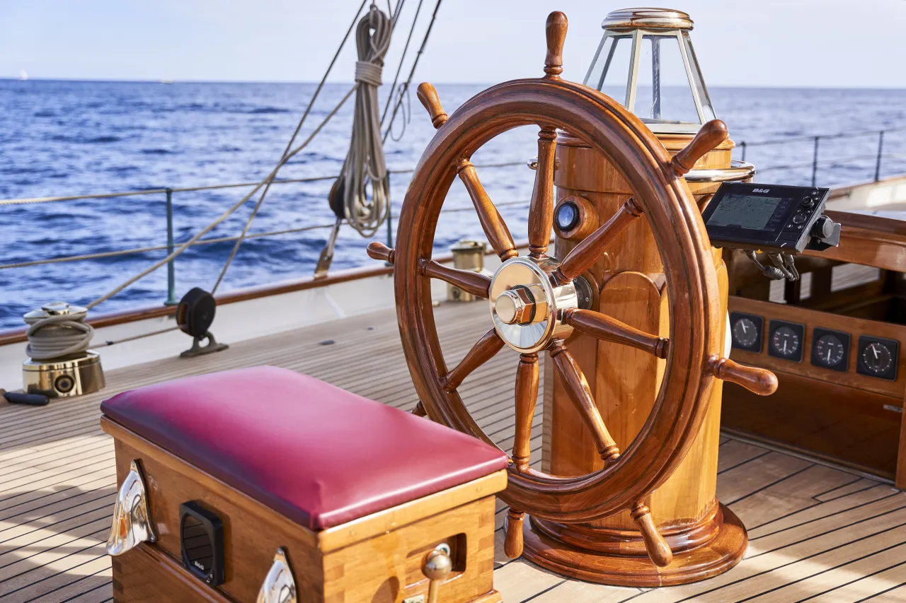 Join the captain at her beautiful wooden helm.
