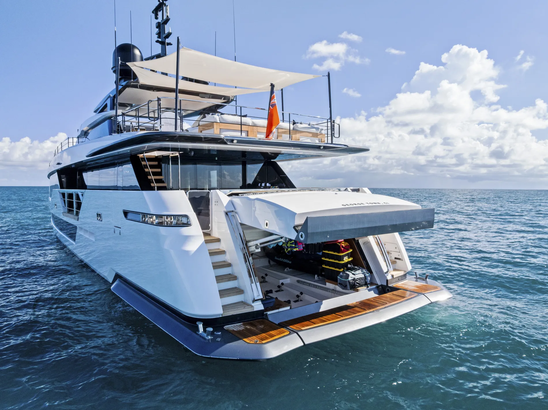 The swim platform keeps the sea within easy reach for toys, tender arrivals and departures, and impromptu swims.