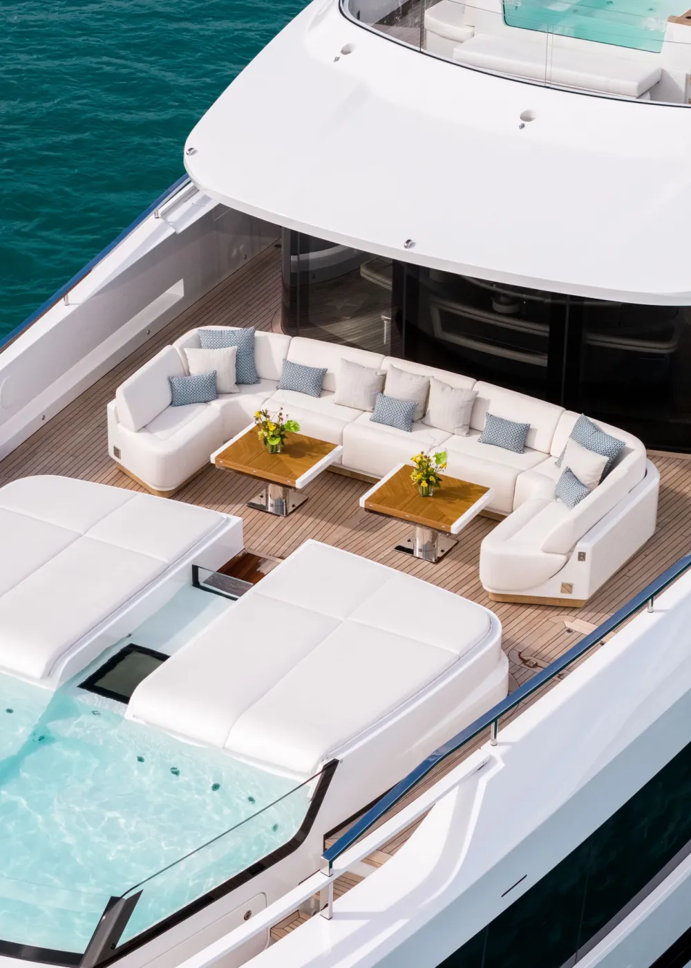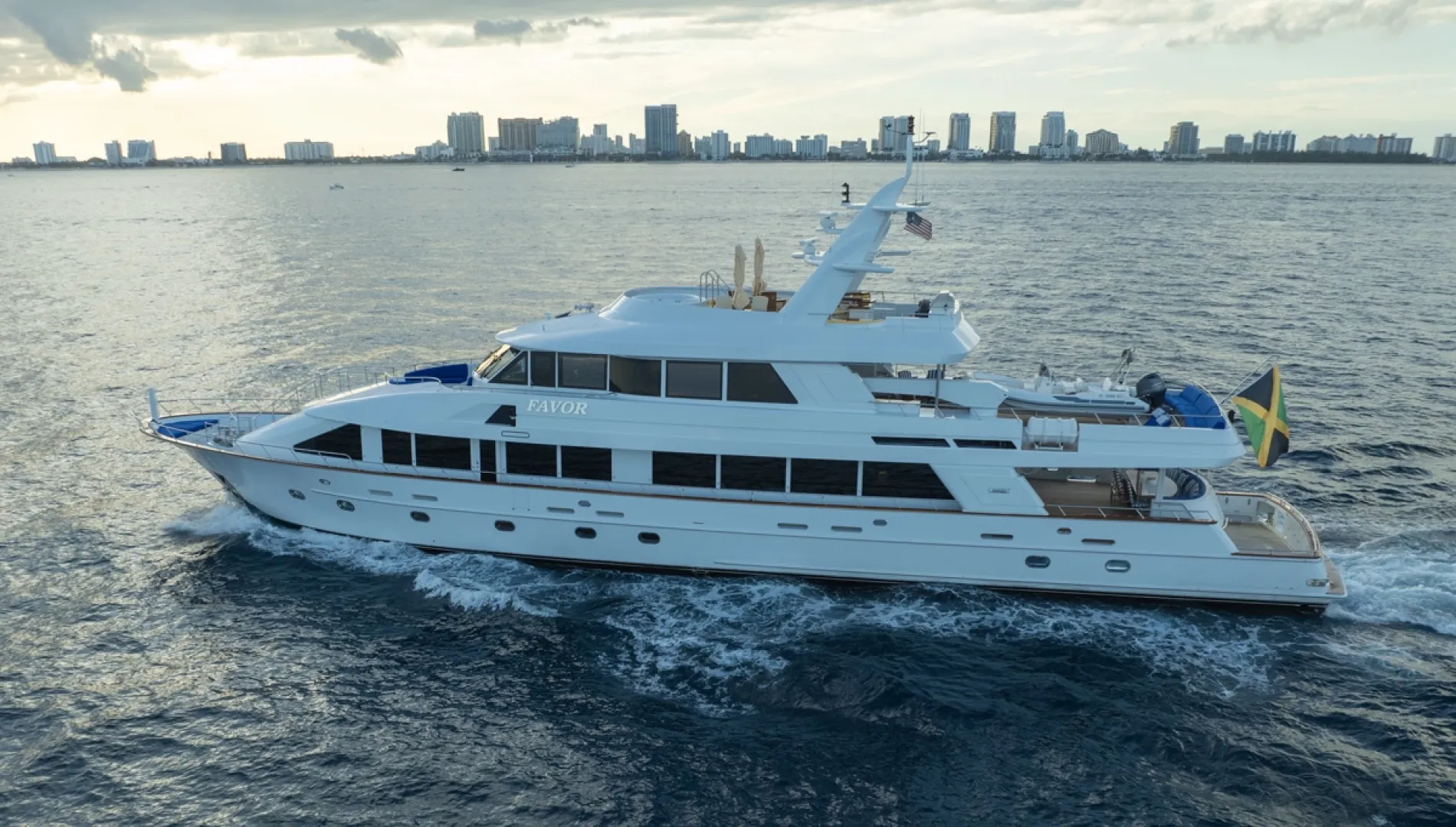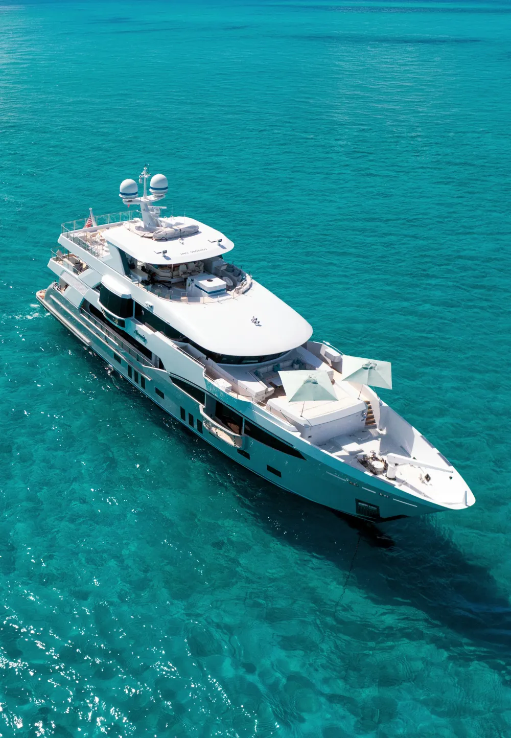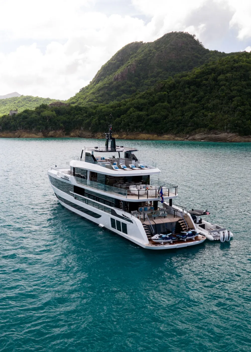 FAVOR offers a relaxed, spacious setting for island hopping, family time and warm-water cruising. Available for charter year-round in the Caribbean, guests can enjoy a large sun deck, family-friendly swim platform, and all-weather al fresco dining, complemented by a 32ft Intrepid chase tender for high-speed transfers and day trips.