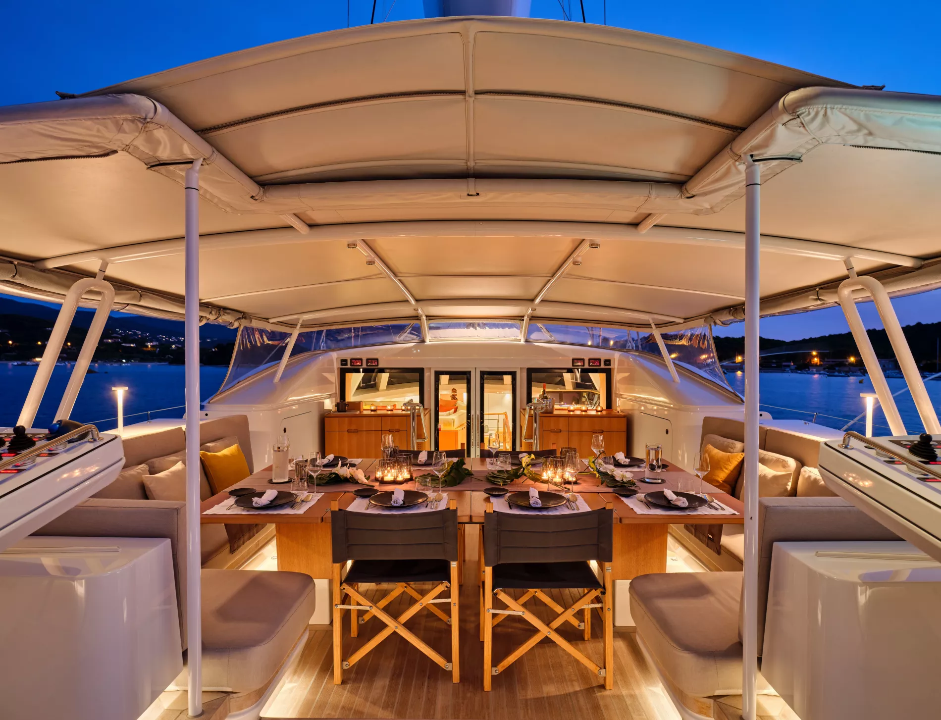 A shaded setting at anchor for al fresco dining throughout the day.