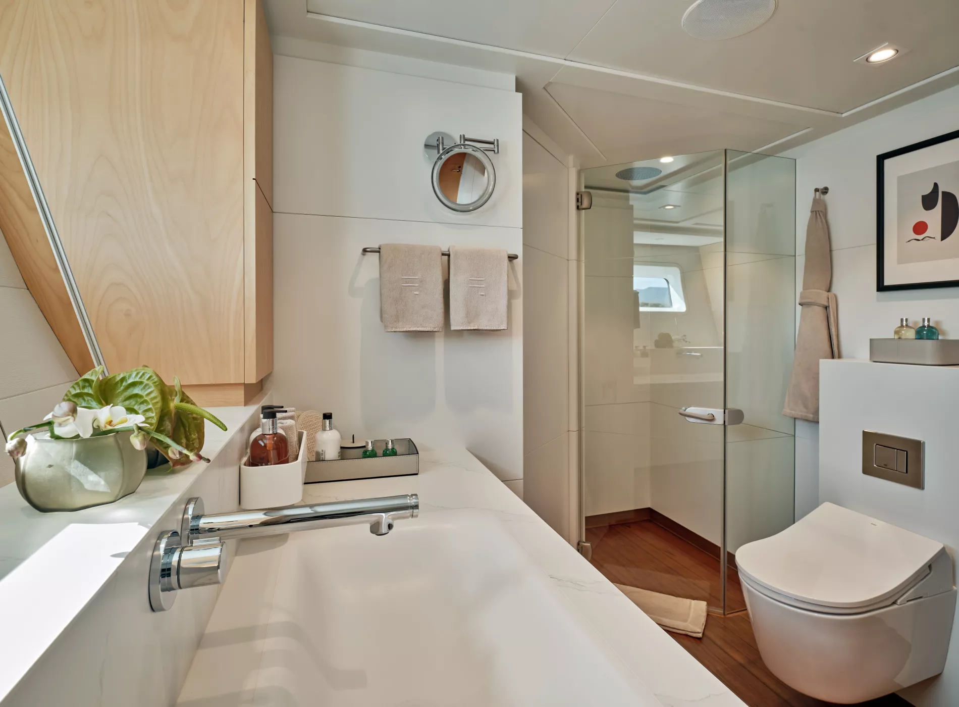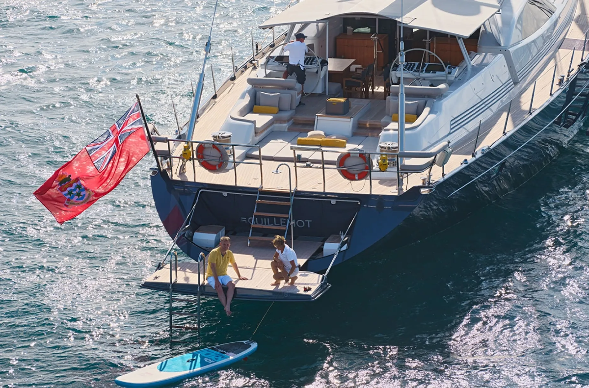 Sunpads and loungers invite all-day relaxation at anchor or underway.