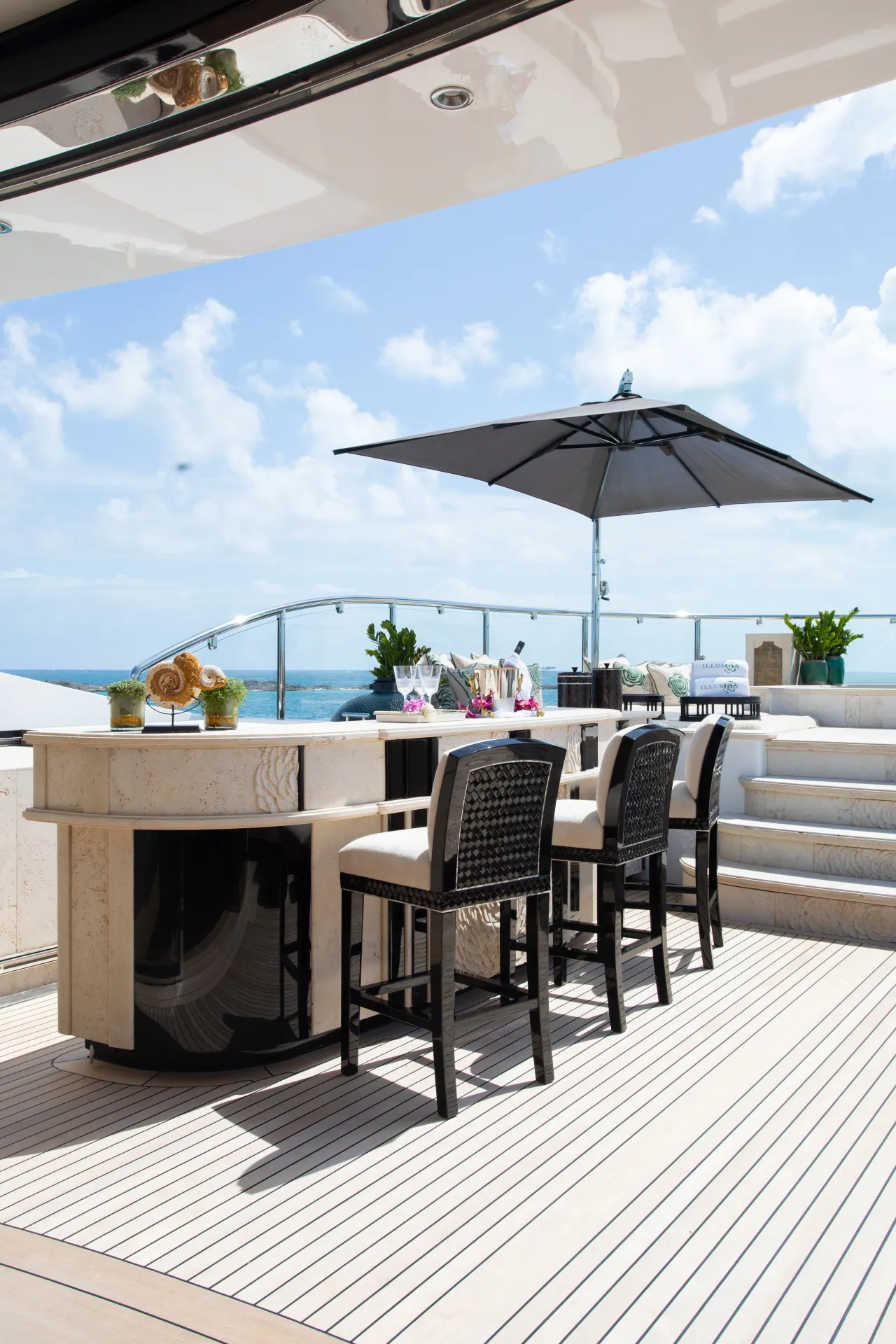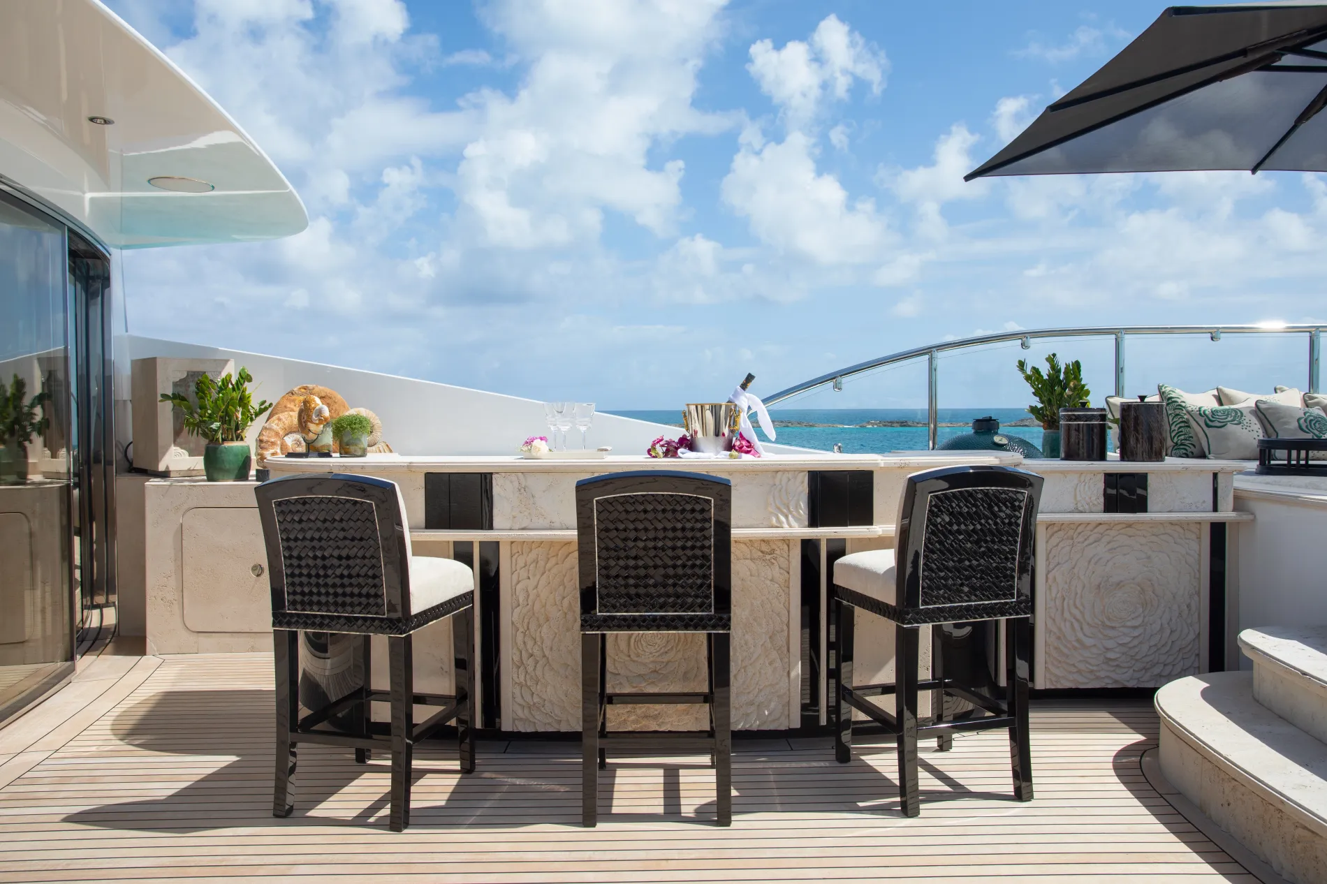 The aft terrace hosts one of two al fresco dining areas on board, with seating for 14, corner sofas, and a sit-up bar ideal for cocktails at sunset.