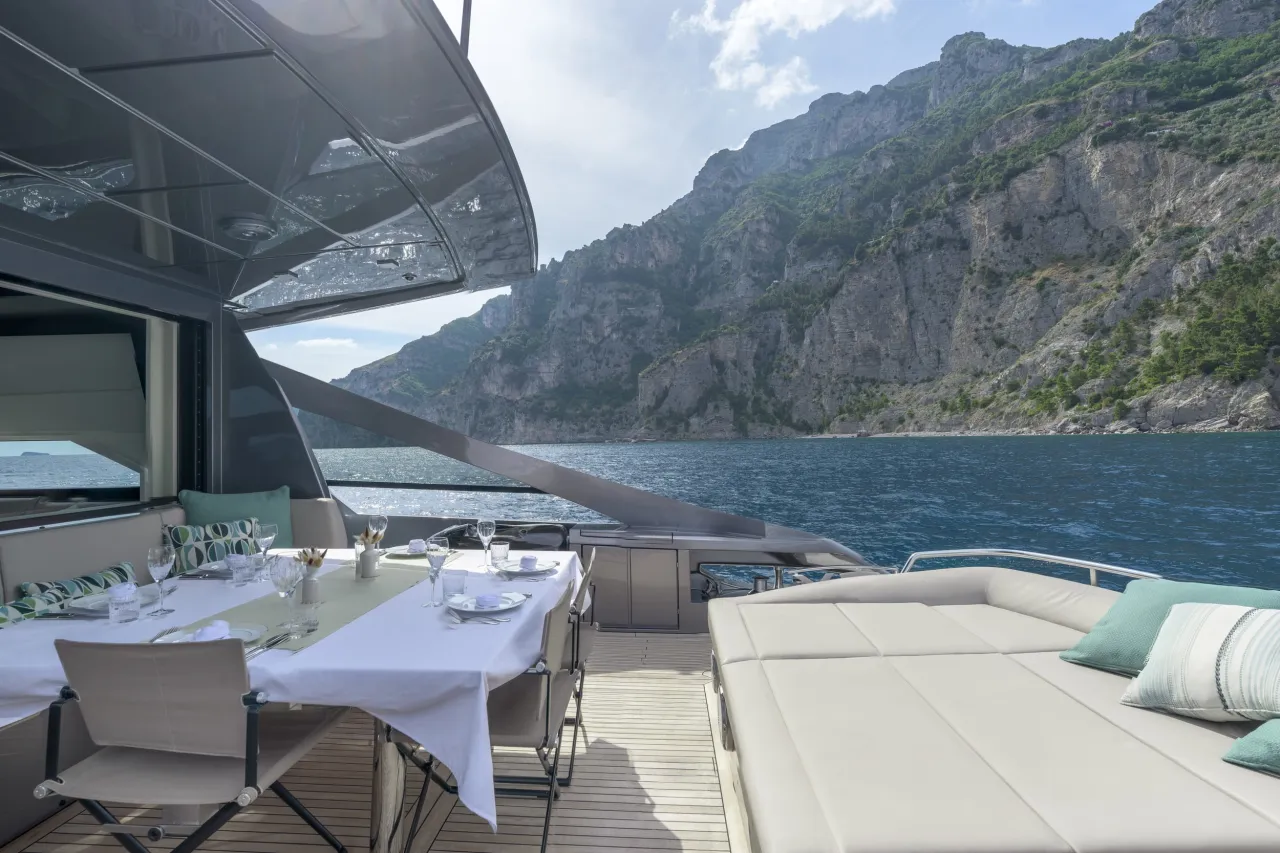 Designed for entertaining with cushioned sunpads, a U-shaped lounge with a dining table, and a flybridge helm.