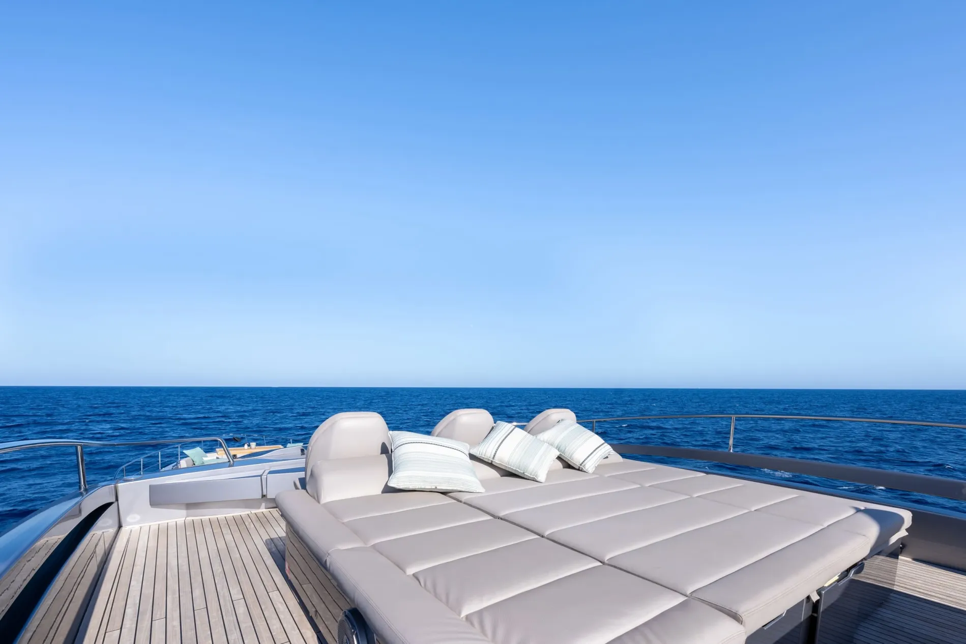 The foredeck lounge is the ultimate sun trap, with cushioned sunpads and space to enjoy the Riviera views.