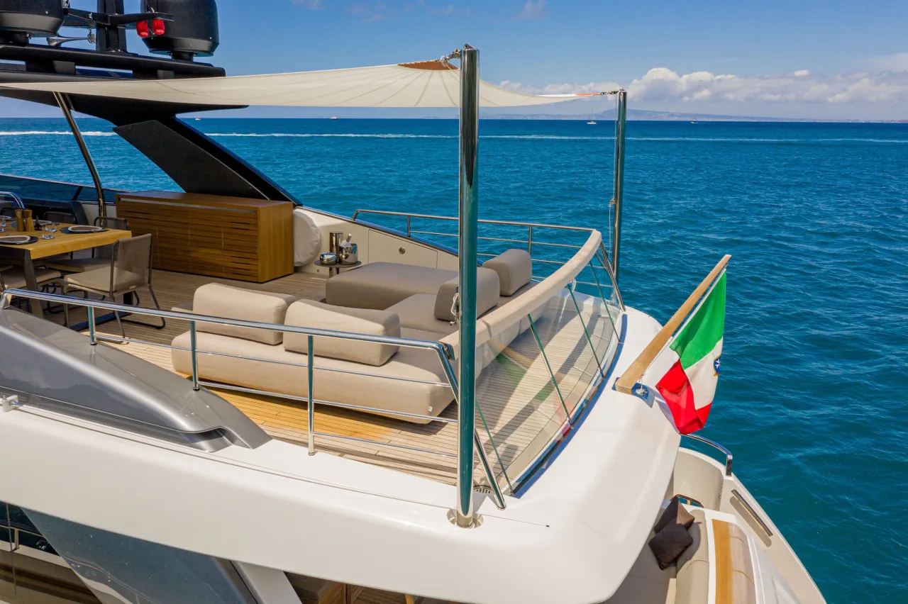 Exterior living is one of LUCKY’s biggest draws. She offers a notably generous flybridge for a yacht of her size, a main deck aft dining area overlooking the stern, and a forward lounge that feels more private and sheltered.