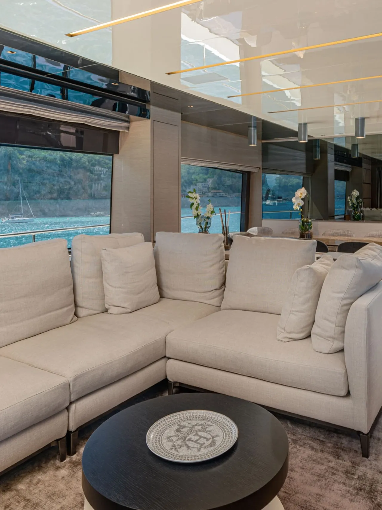 Large sliding glass doors open from the aft deck into the main salon, where broad windows bring in natural light and create a close connection to the sea.