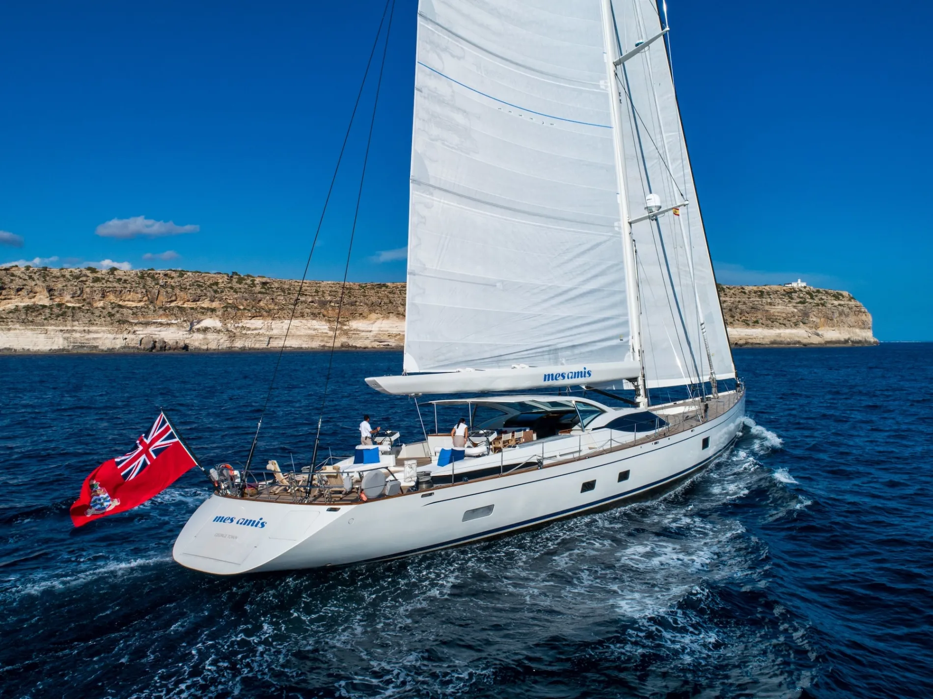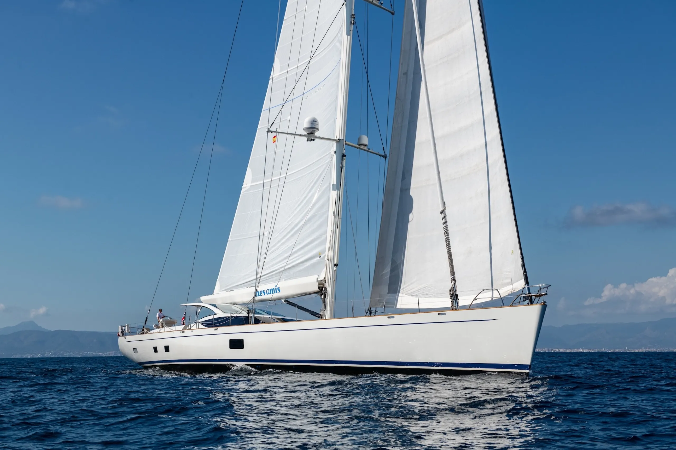 MES AMIS is an award-winning sailing yacht designed by the late Ed Dubois, one of the defining figures in modern sailing yacht design. With dining on deck, a split-level salon and the 15m SACS chase boat LA PETITE AMIE, she is built for life close to the water and greater freedom to explore.