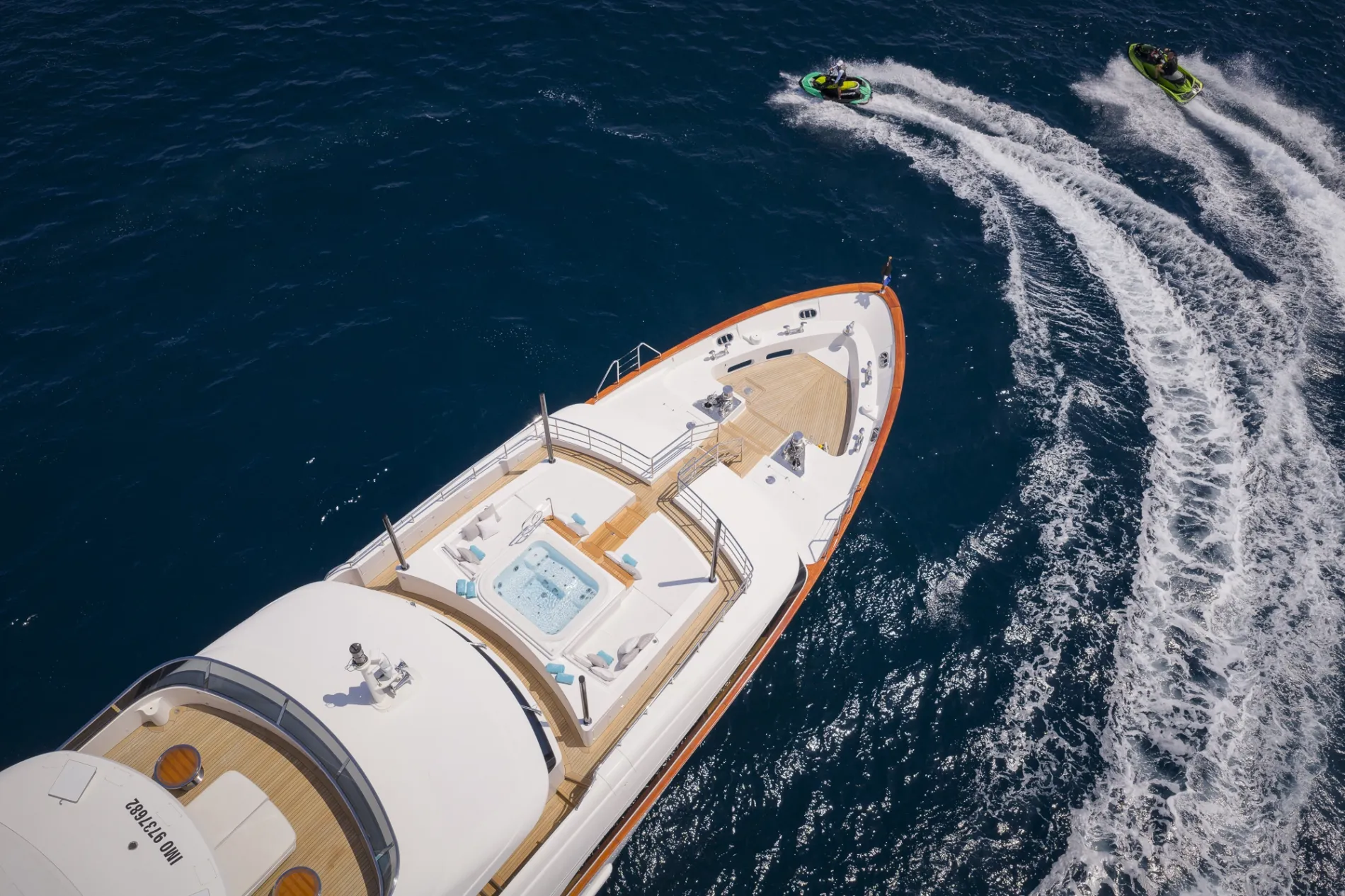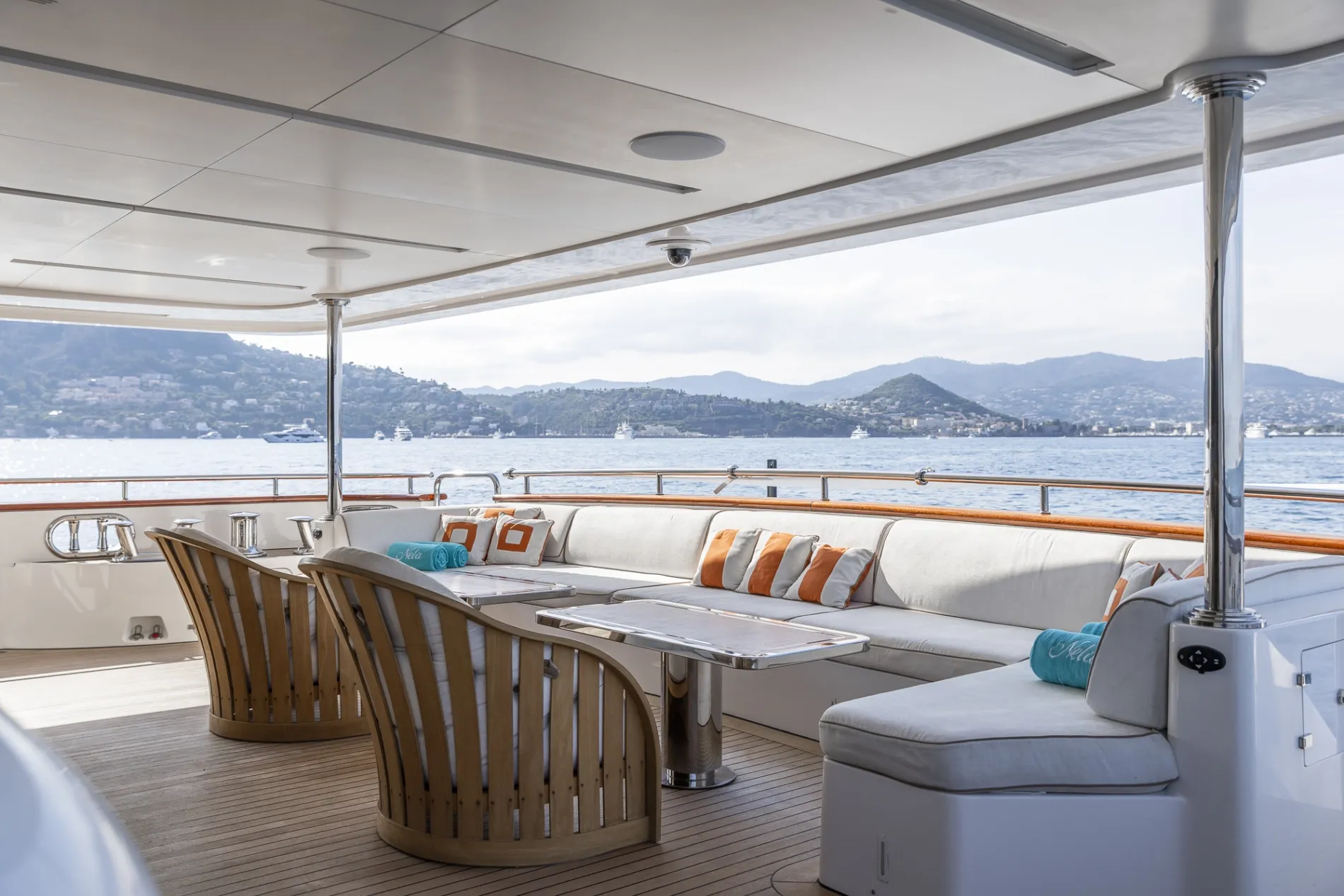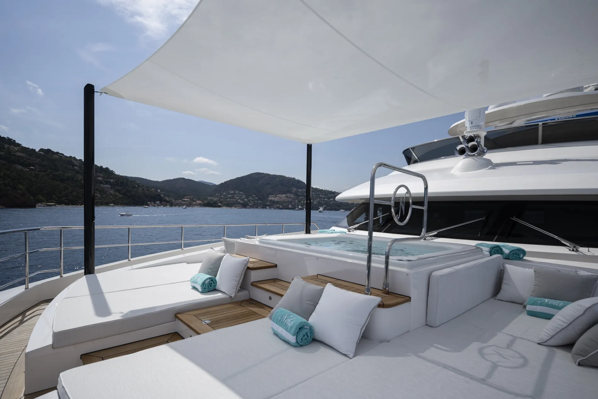 Her crown jewel is a sprawling sun deck, where deep sink-in sofas, generous sunpads and loungers invite guests to unwind beneath a retractable sunshade.