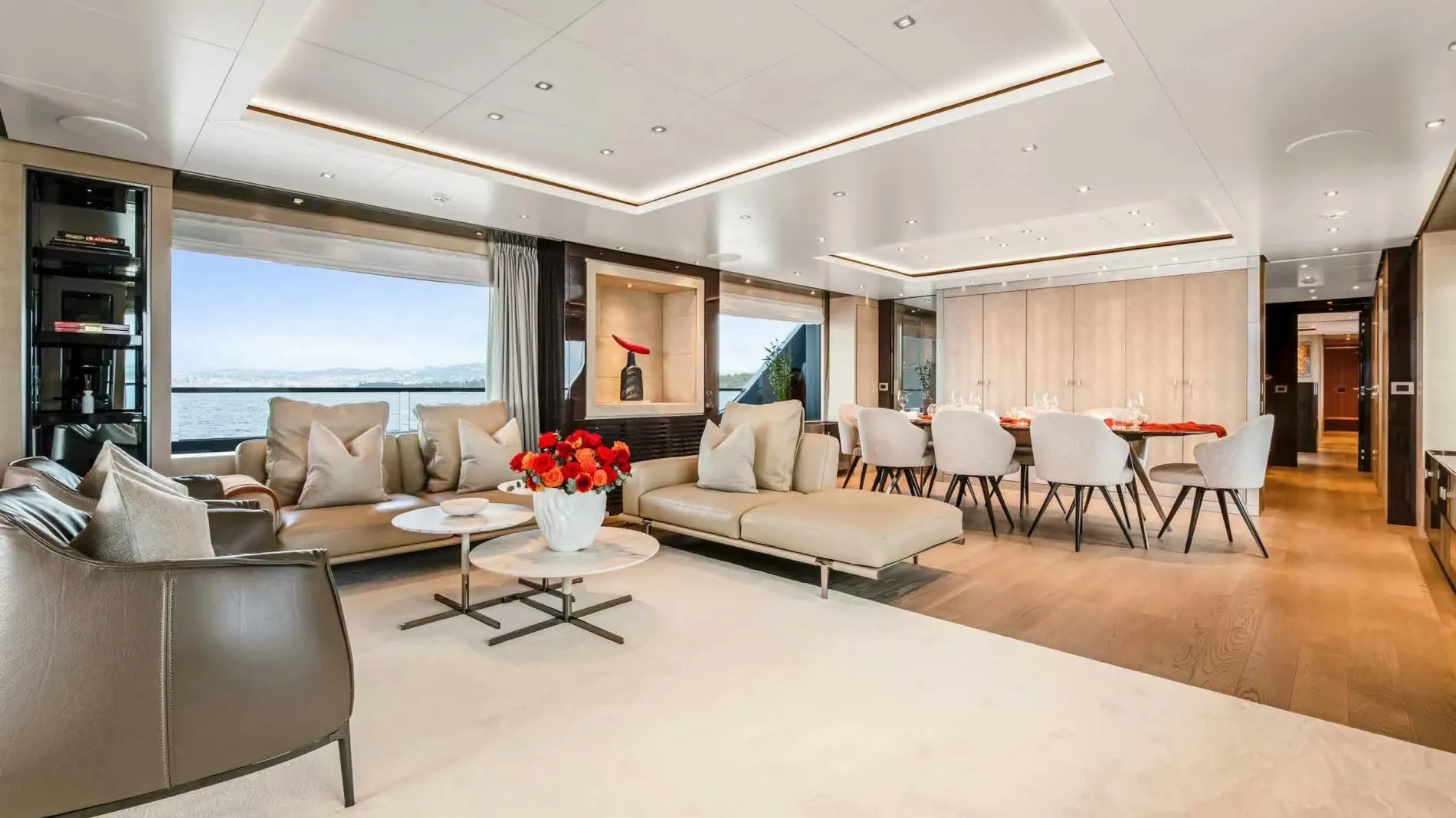 Nuri's interiors, crafted by Francesco Paszkowski, blend contemporary elegance with open spaces. Featuring floor-to-ceiling windows that flood natural light over stunning views. Neutral furnishings foster a serene atmosphere while the main salon dazzles with panoramic glass, and the upper lounge adds playful blue accents, cozy seating, and a games zone.