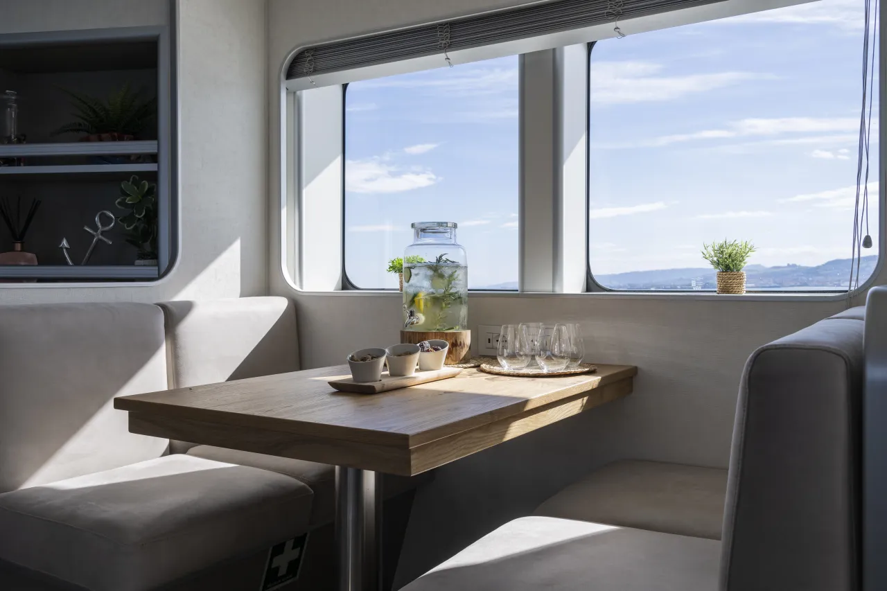 A cool retreat from the sun, Ourway’s interior pairs soft textures with light woods and muted tones. New furnishings and entertainment systems elevate her lounges, while picture windows frame the view.