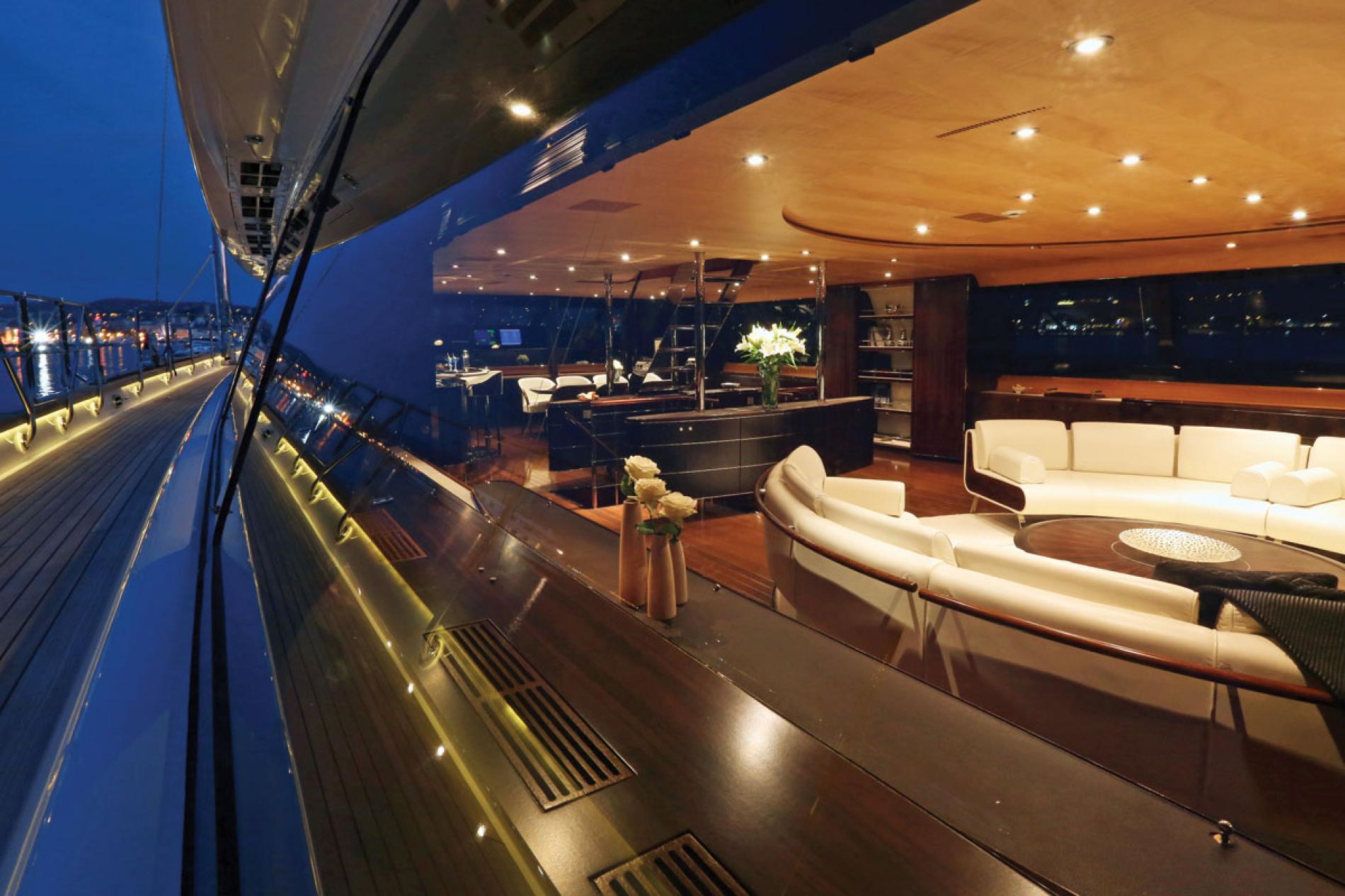 A versatile dining area, shaded by the flybridge and sheltered by glass windbreaks without compromising the view.