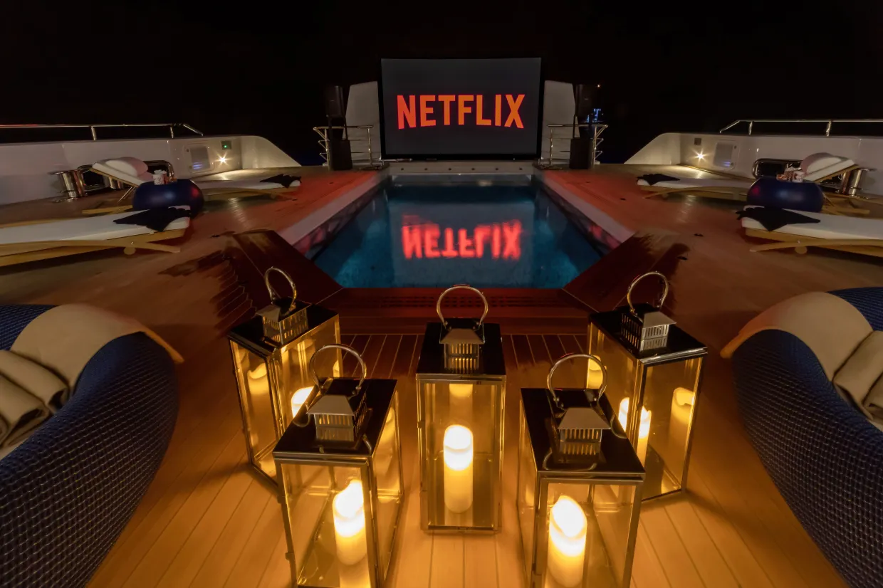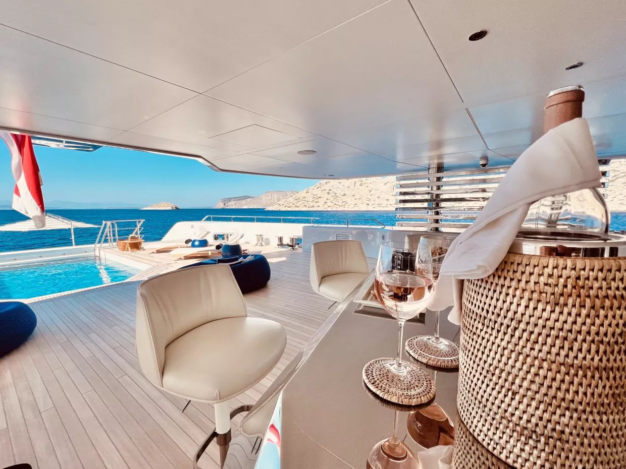 The main deck’s centrepiece is a 7.5m x 3m swimming pool surrounded by loungers and daybeds.