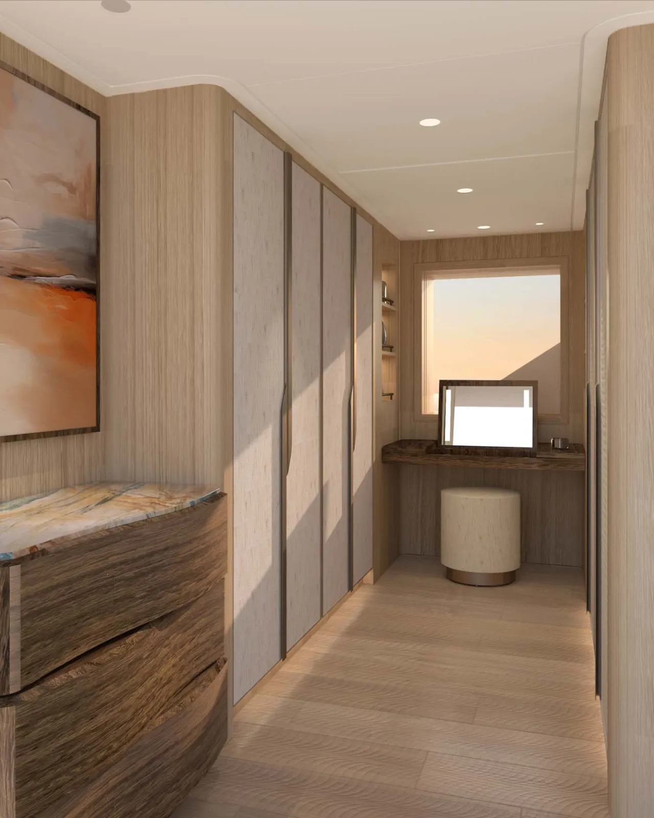 Set forward on the main deck, this full-beam suite is a private sanctuary, with a lounge, dressing room and generous en suite with his-and-hers basins, a bath and rain shower. Near full-height trapezoid windows fill the room with light and far-reaching sea views, while the fold-down balcony offers a private spot above the water.