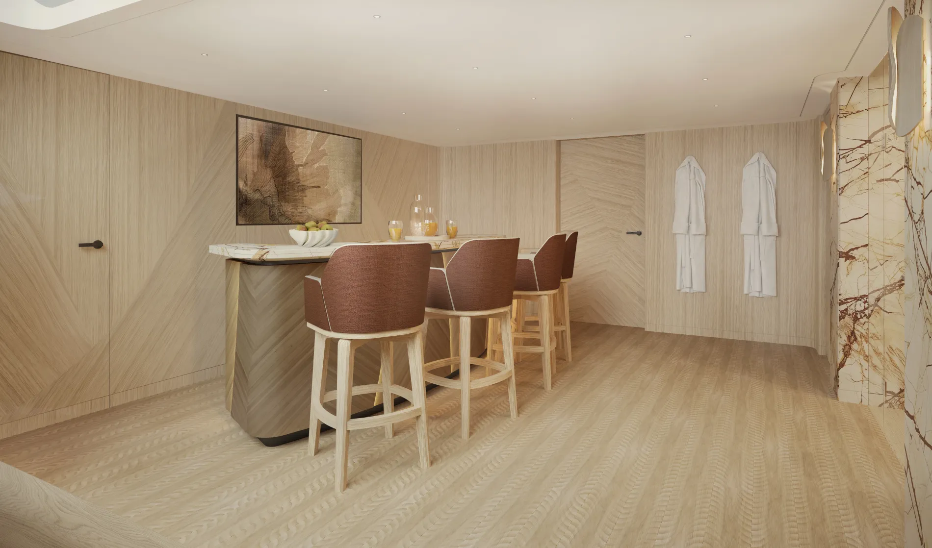 With a sit-up bar, glass-walled sauna and swim platform the beach club brings guests right to the water’s edge. Set up with loungers and parasols, the swim platform works as an all-day lounge with hydraulic stairs leading into the water.