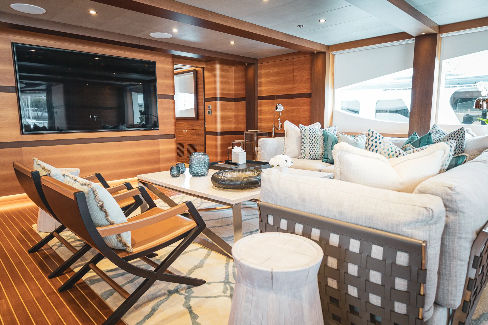 As fresh as the day she was launched, the main salon welcomes natural light through expansive windows. A cinema setup transforms the room into a private movie theatre for family evenings on board.