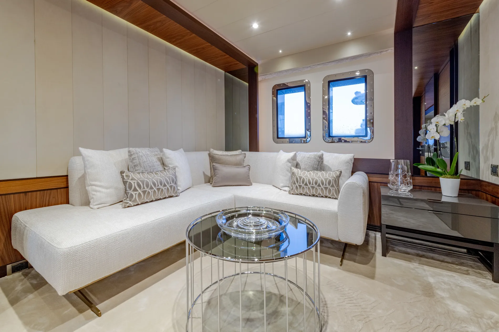 A sofa forward provides a quiet spot for panoramic views over the bow.
