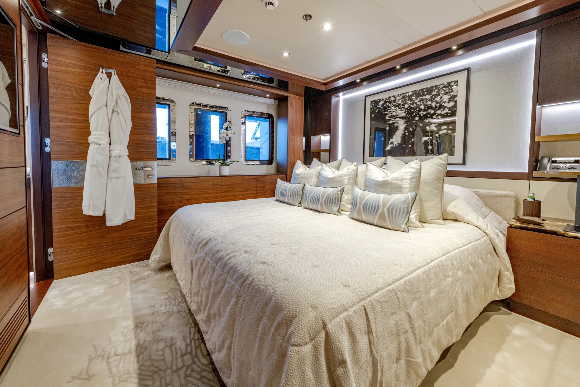Located on the main deck, the full-beam master features a private office, king bed, walk-in wardrobe and a generous en suite bathroom.