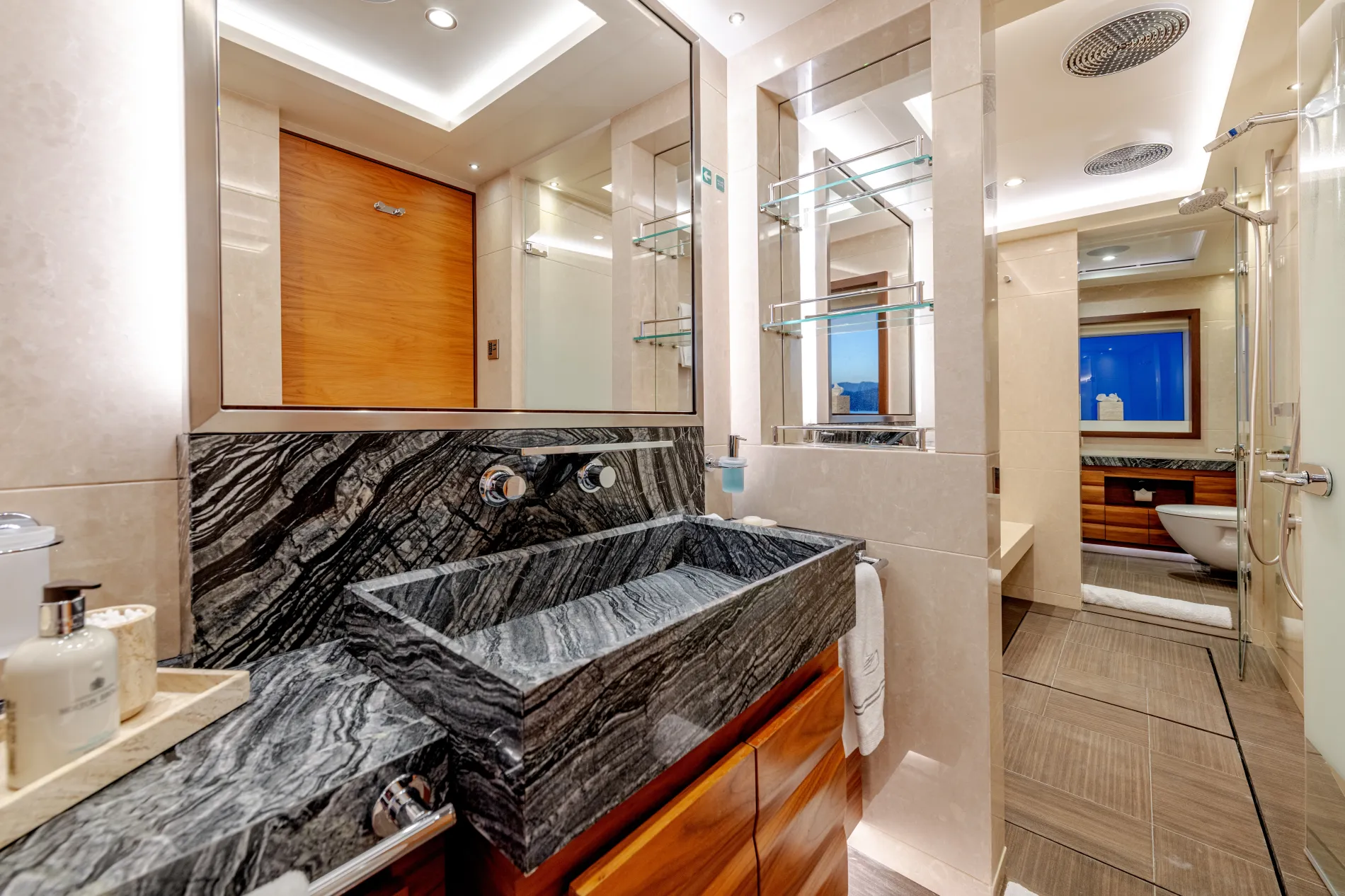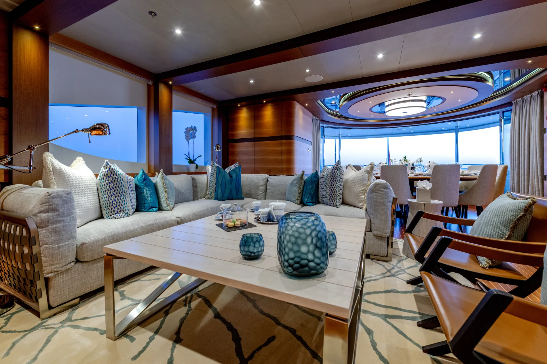 A full-beam suite on the lower deck rivals the owner’s cabin, offering a private lounge, study and an expansive en suite.