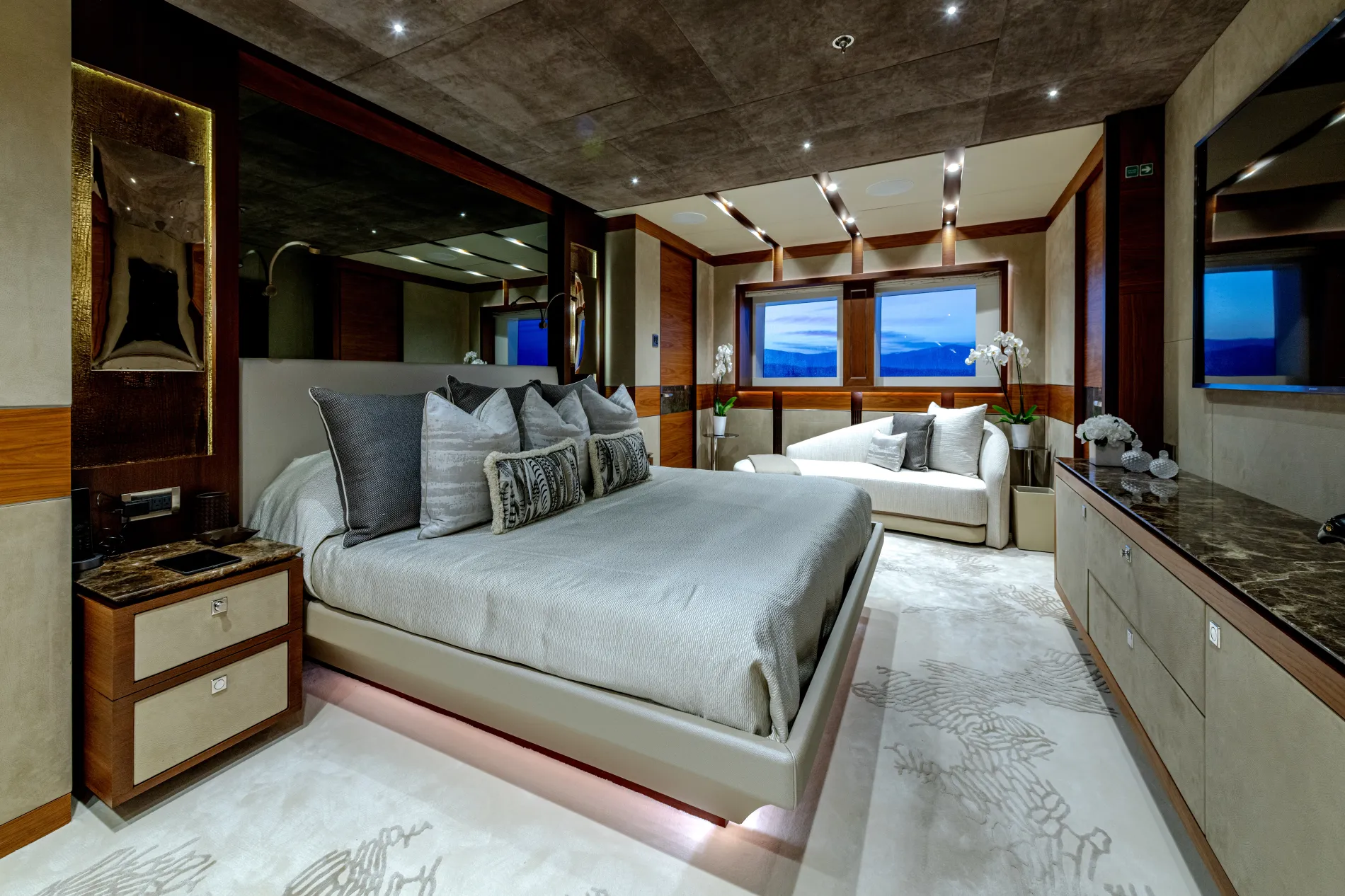 Designed by British Studio H2, Quasar’s interiors use walnut and wenge woods, soft neutrals, and tactile finishes to create a calm, contemporary retreat. The main salon transforms into a private cinema, while the skylounge flows seamlessly into the upper deck.