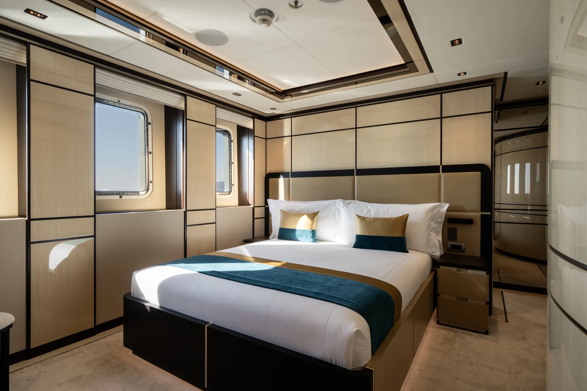 More akin to a private apartment, the full-beam owner’s suite sits on the main deck, framed by floor-to-ceiling windows.