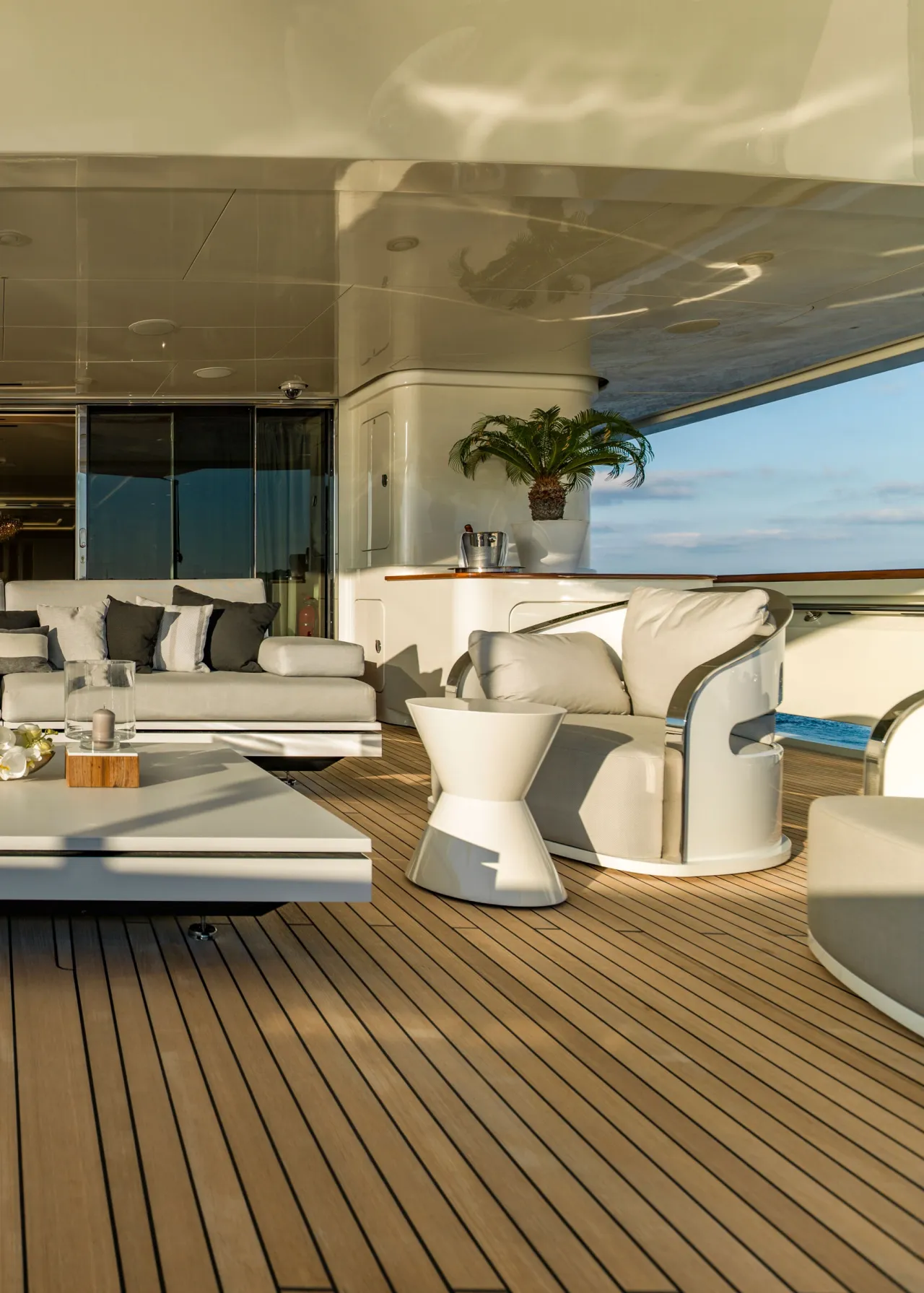 A spacious main salon features a backlit onyx bar and plush seating, while forward is a grand dining area for 12.