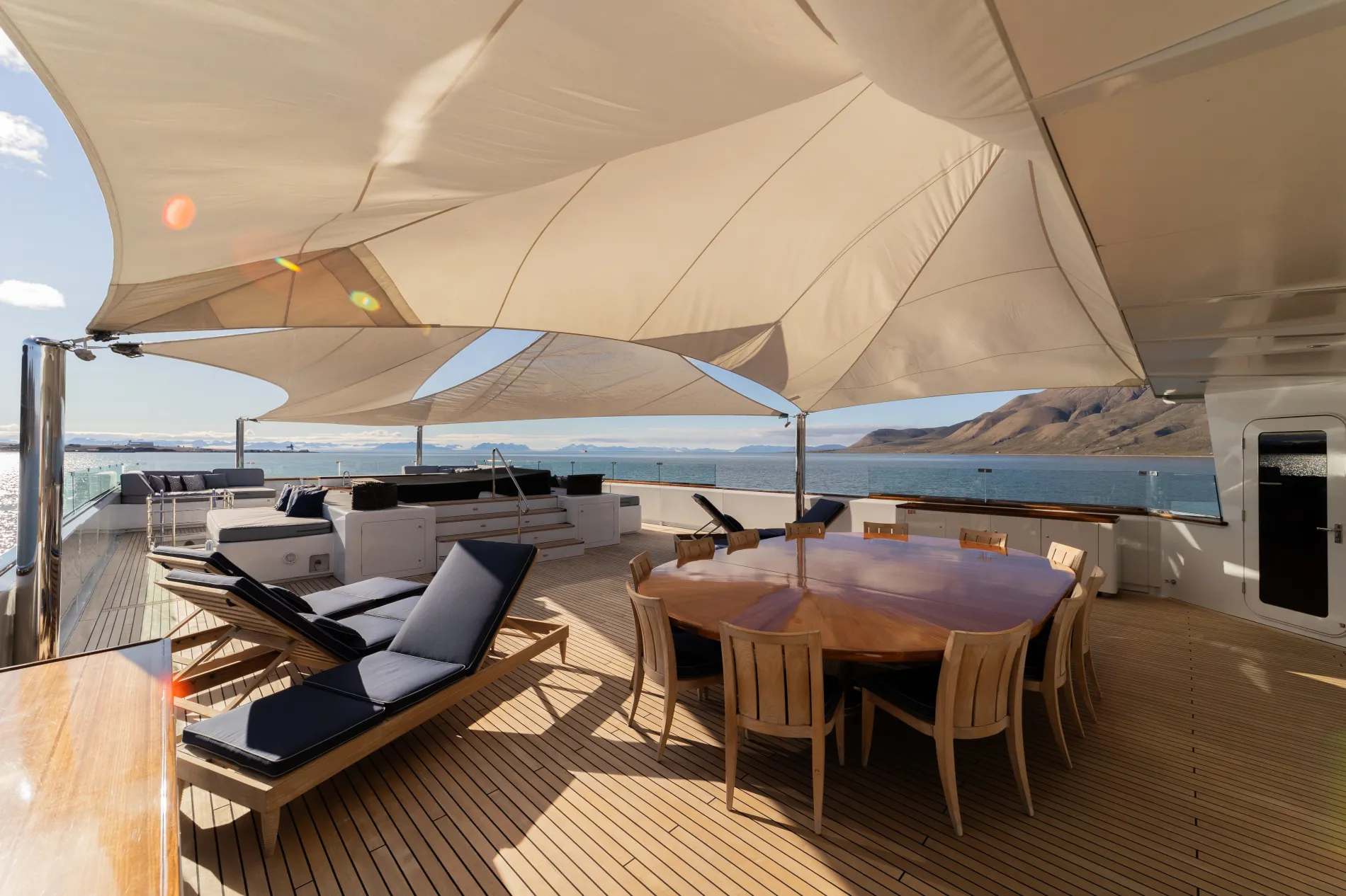 A Jacuzzi, sun pads, dining area all shaded by awnings.