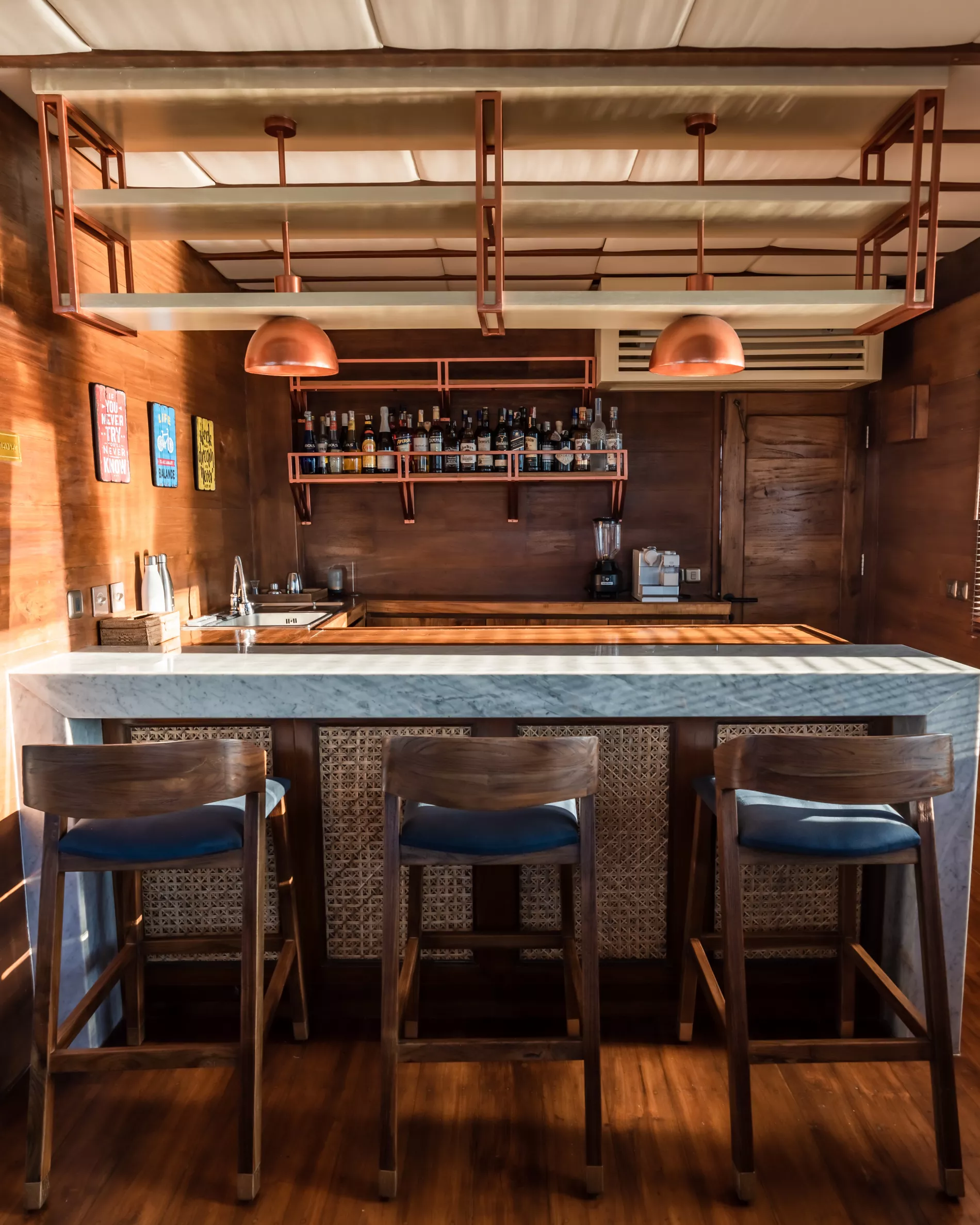 Full-service bar featuring artisanal stone and copper finishes.