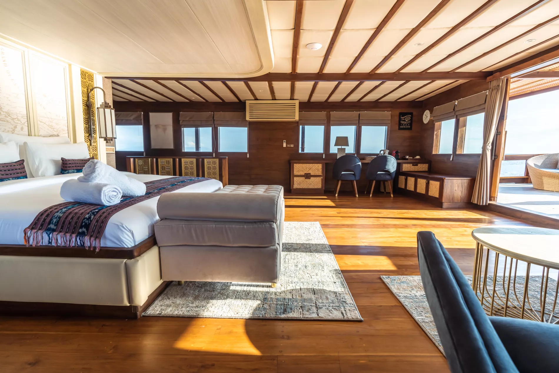 Spanning 120 sqm with 270° panoramic views, this master suite is the largest of any Phinisi in Indonesia.
