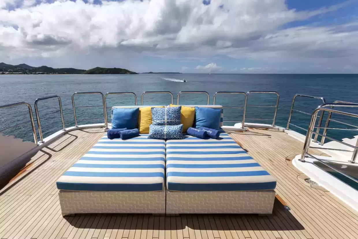 A forward Jacuzzi is surrounded by sunpads with optional parasols.