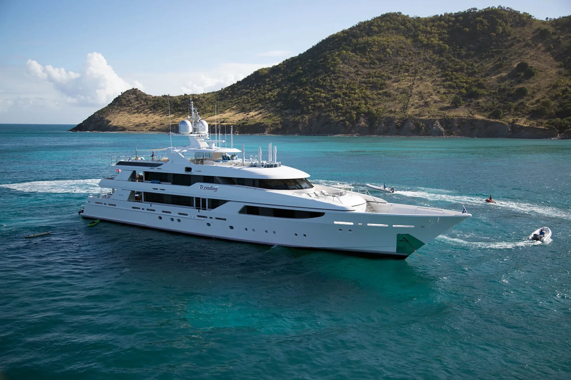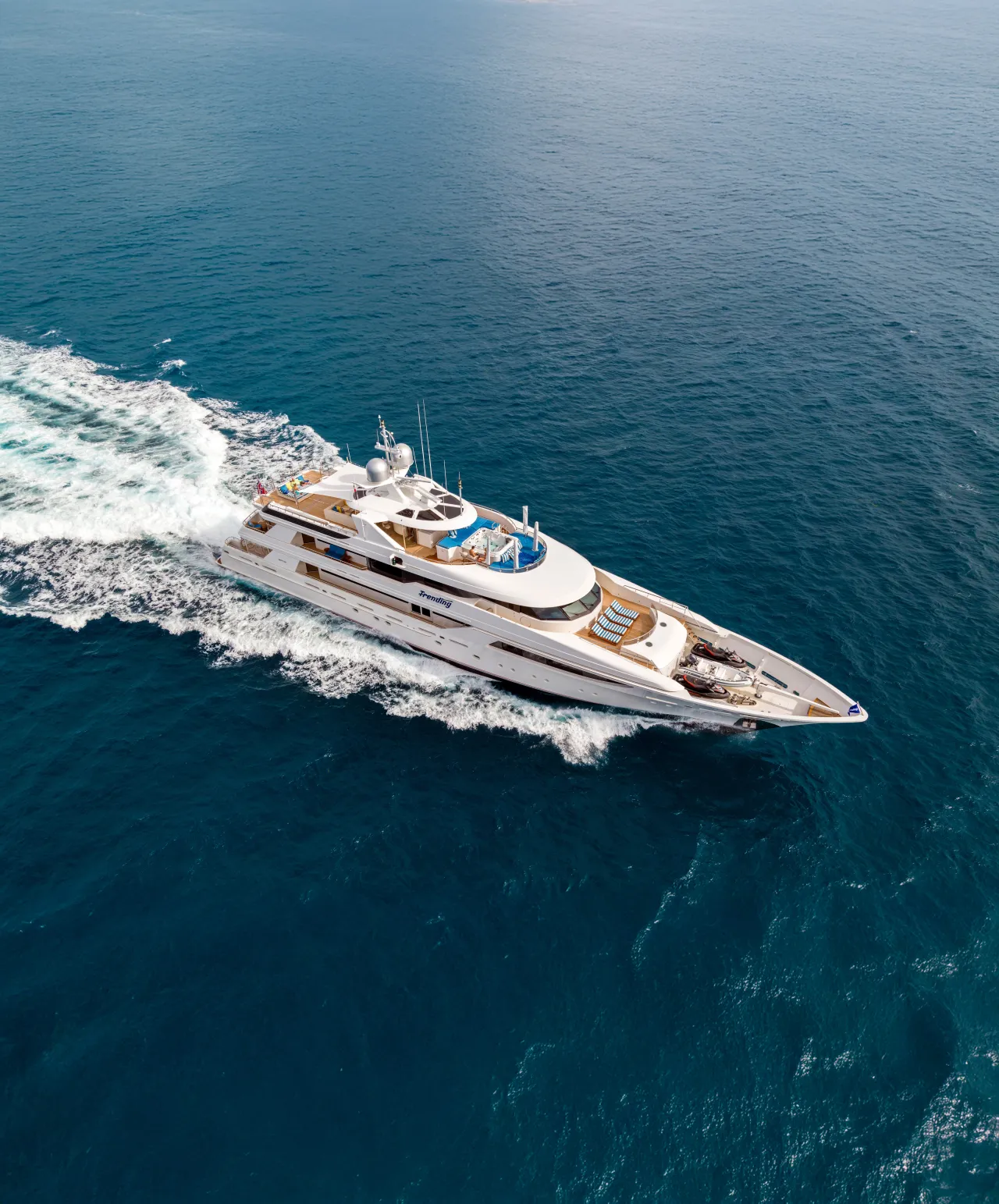 With multiple dining and lounging areas across all decks, Trending is designed for entertaining. Smaller terraces create intimate retreats, while her oversized sundeck features a Jacuzzi, bar, and plenty of space for sunbathing.