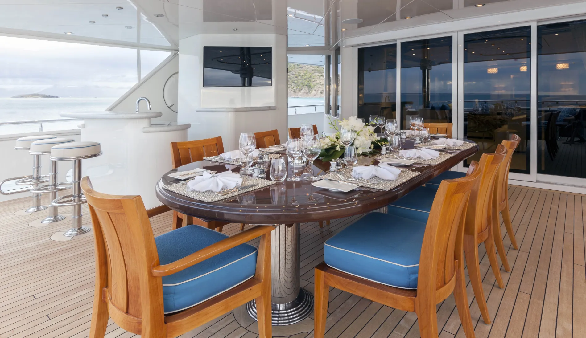 On the bridge deck, 12 guests gather for al fresco dining that’s anything but ordinary. This is where the crew stages themed dinners, pairing exceptional cuisine with imaginative décor to create nights guests never forget.