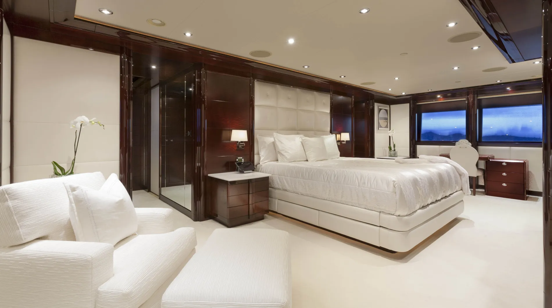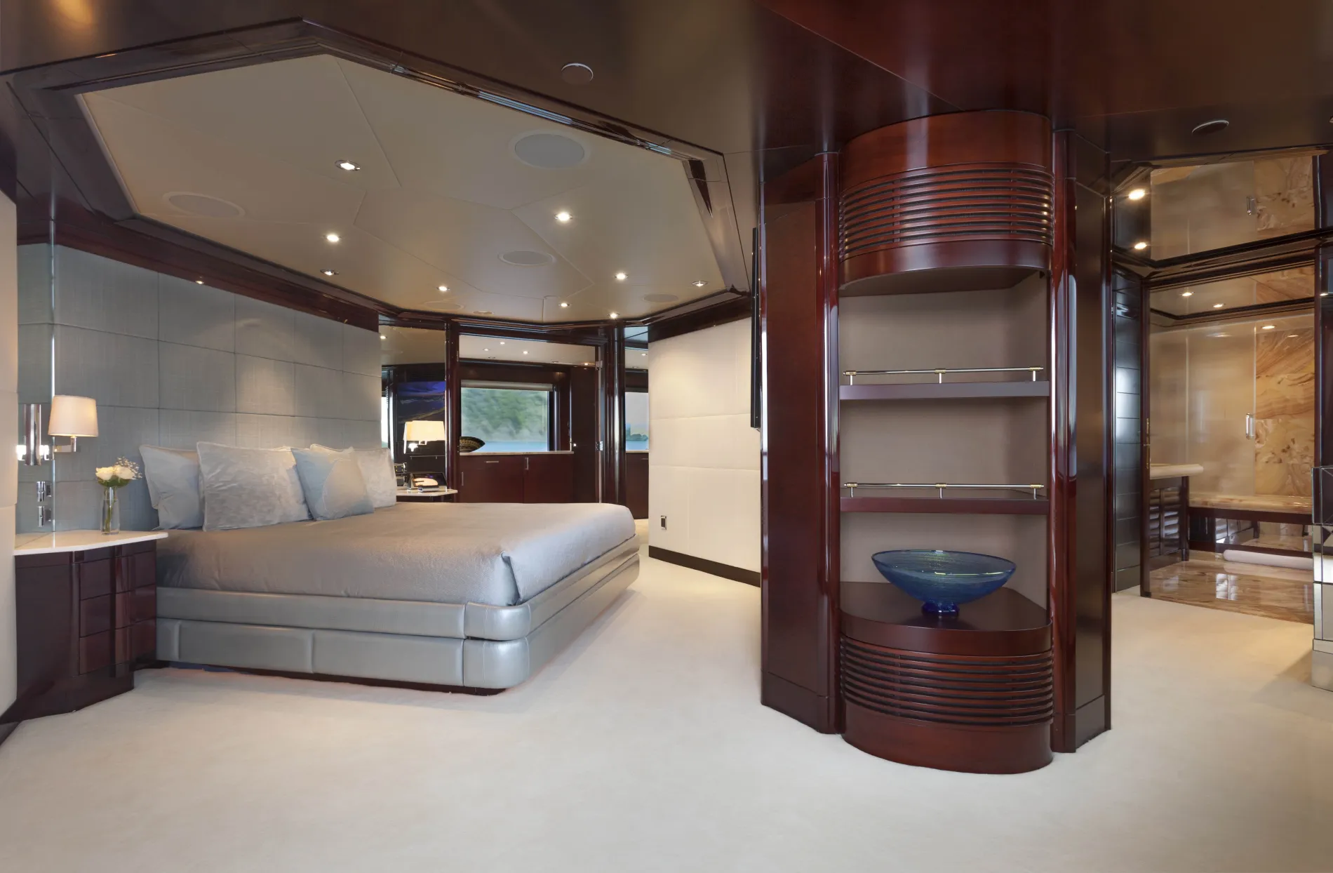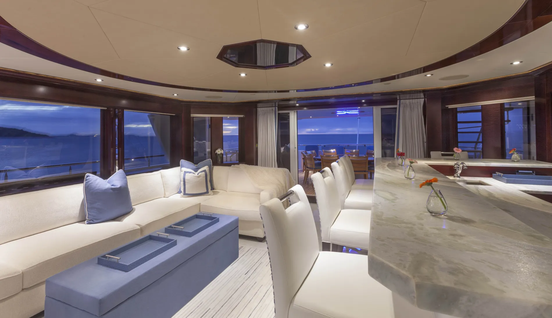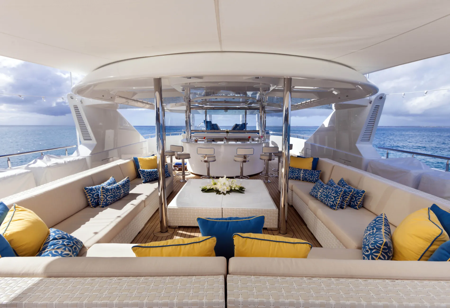 A supersized sundeck invites all-day enjoyment, with two bars for cocktails, a U-shaped settee for lounging together, and an eight-person Jacuzzi surrounded by wide sunpads.