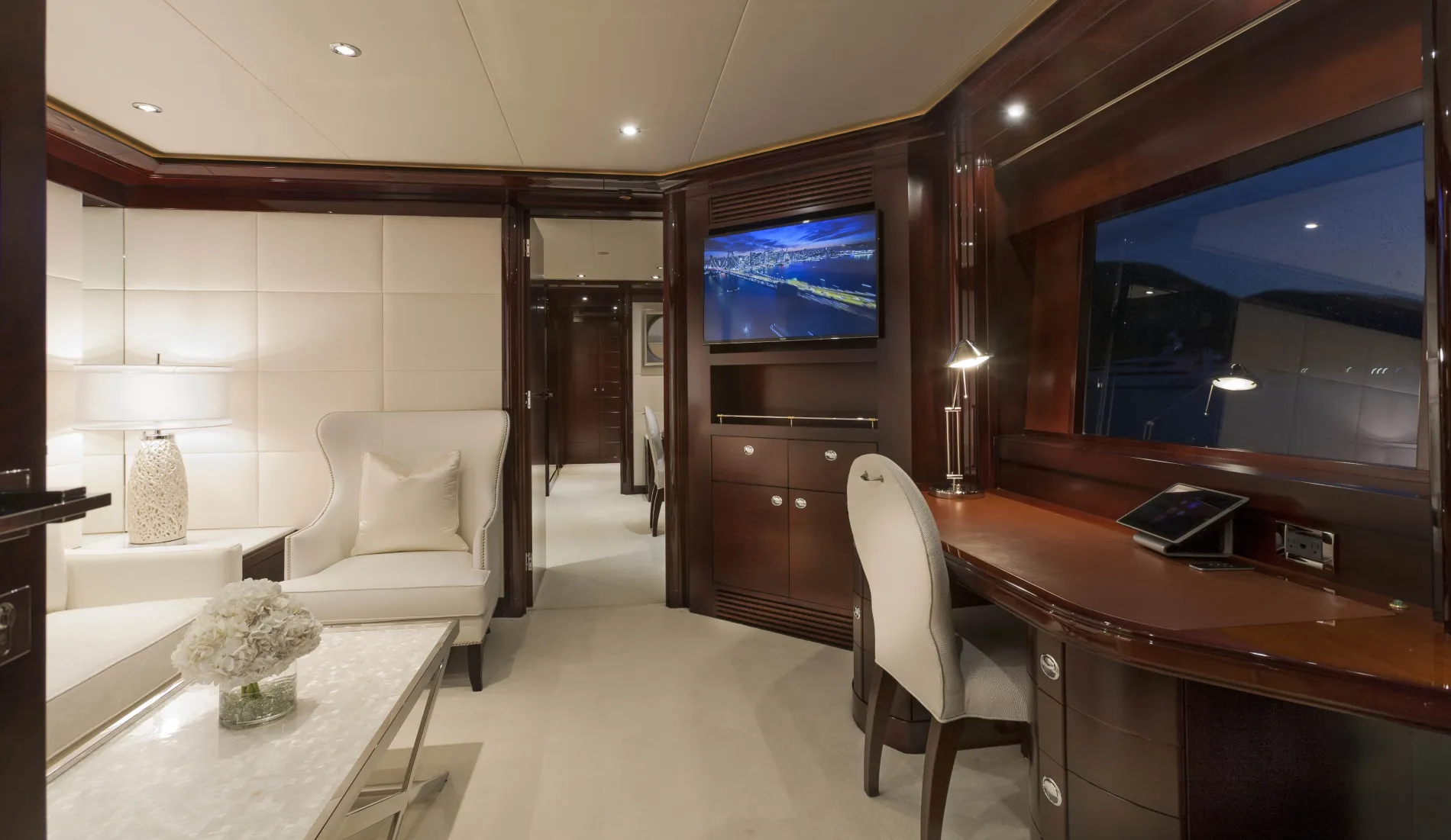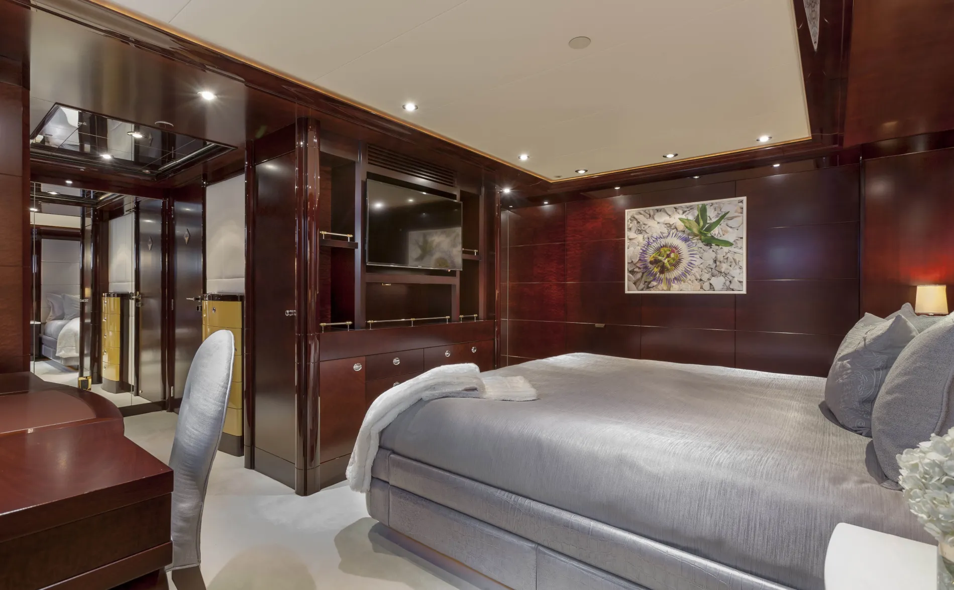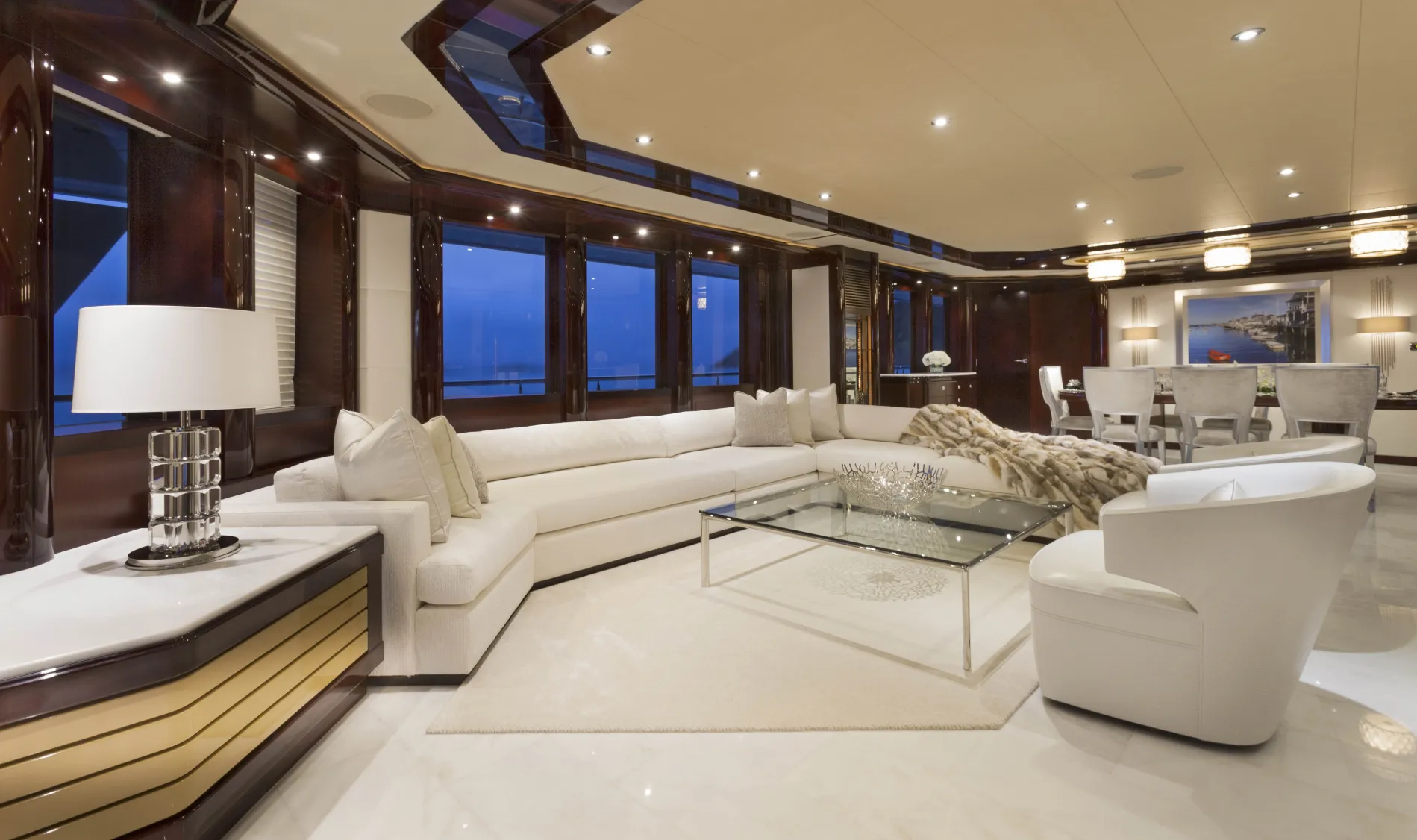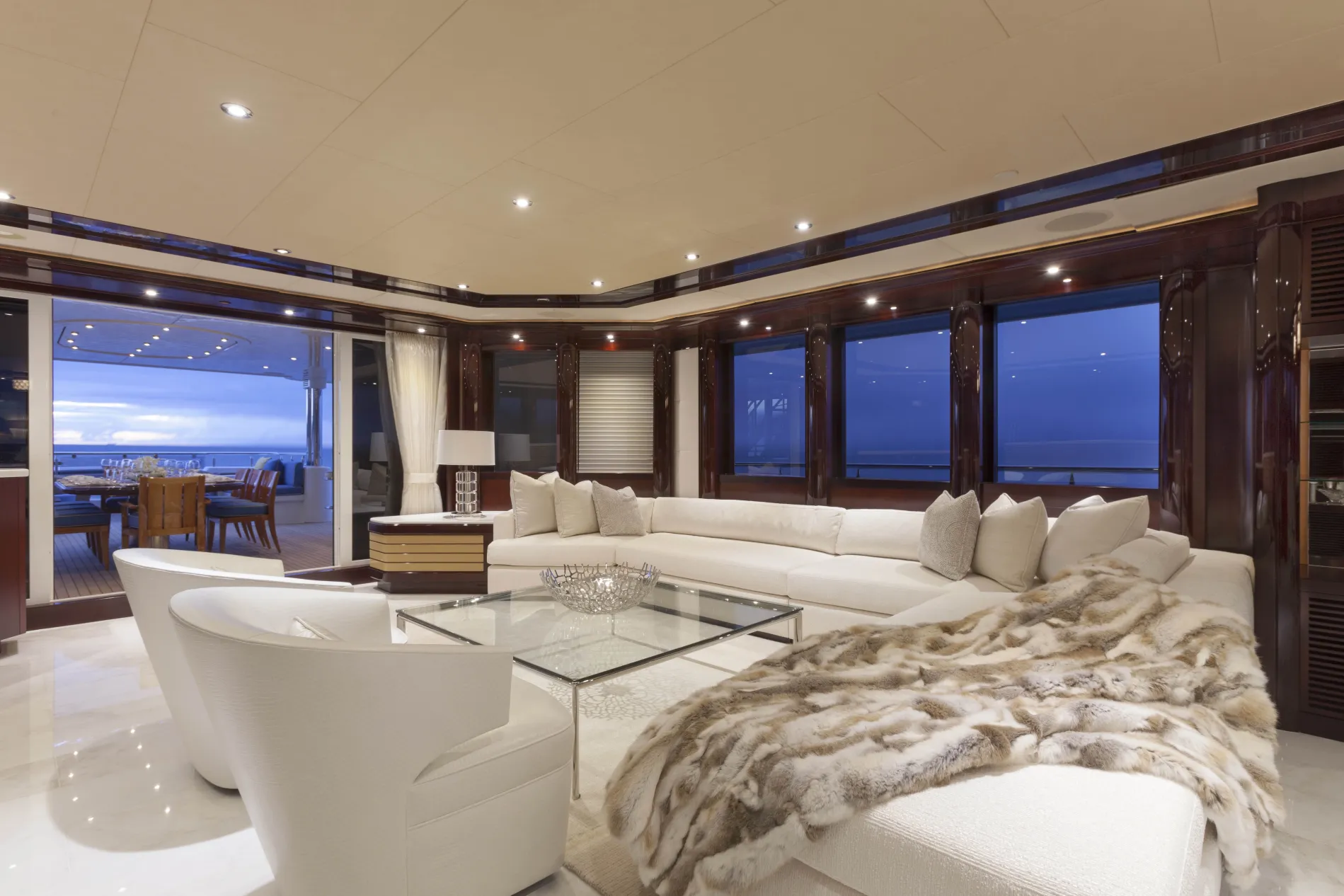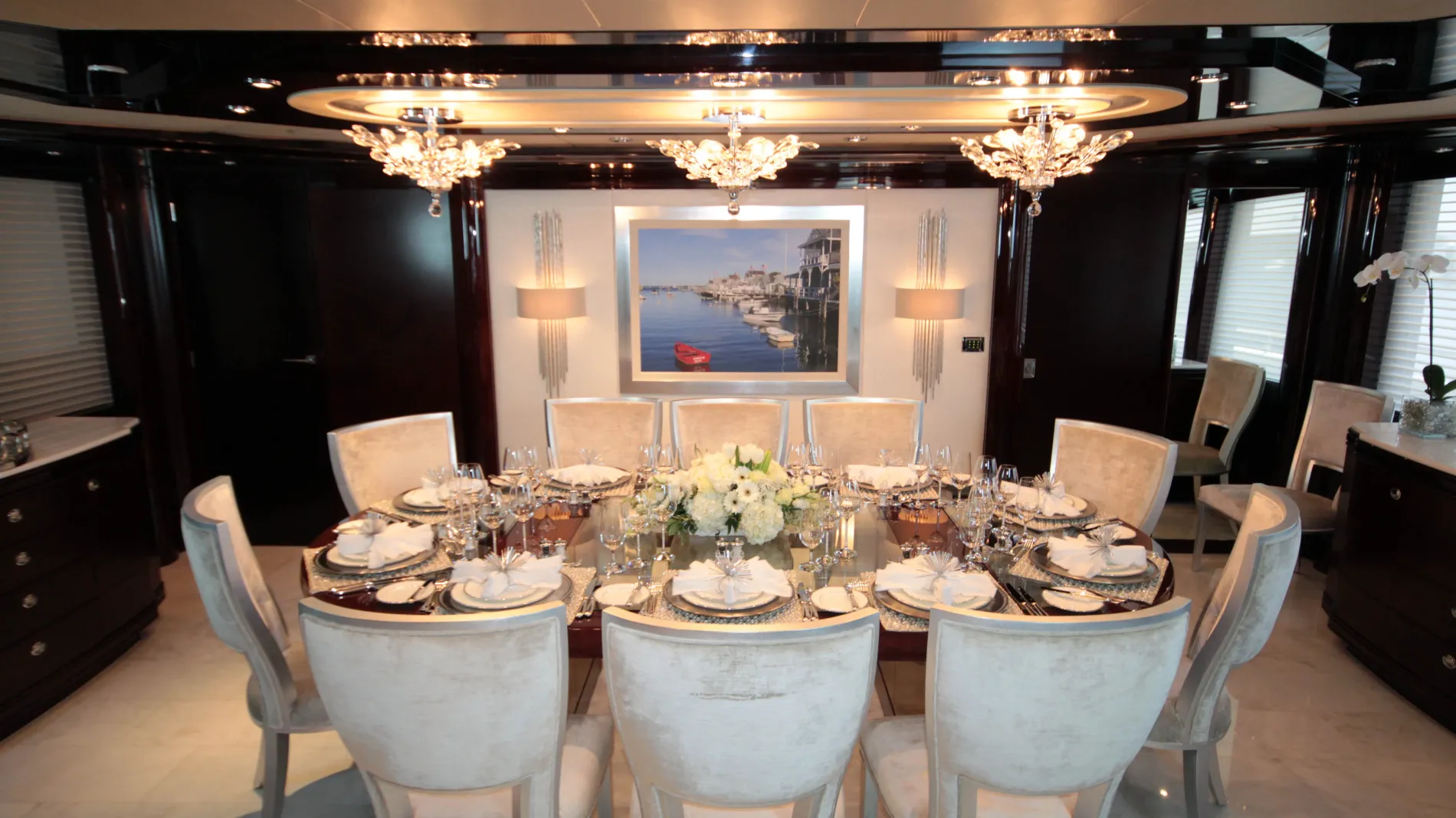 A formal dining space aft of the main salon features varnished hardwoods with silver and cream-toned details that create an elegant setting.