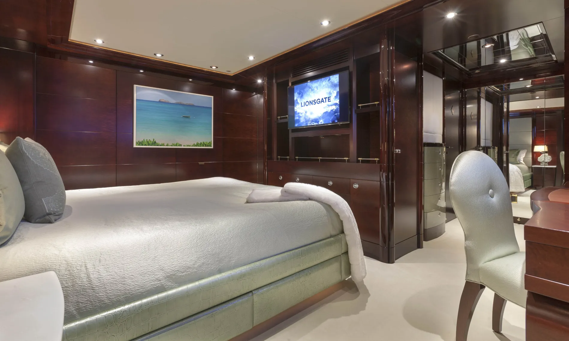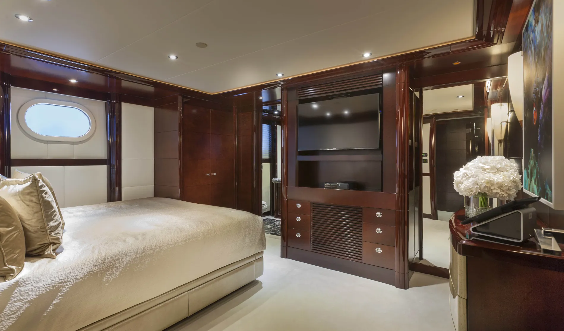 Two large guest doubles are finished in cherry wood and include marble bathrooms. A twin cabin with its own en suite bathroom is ideal for younger guests or staff.