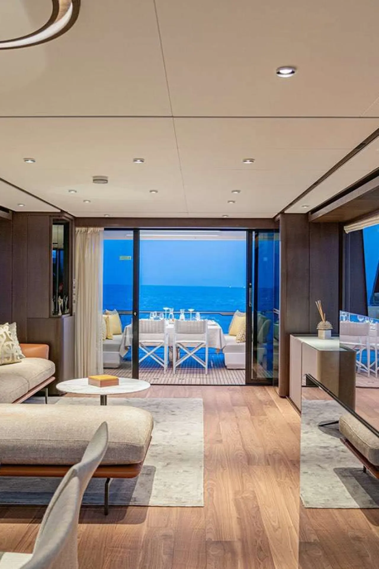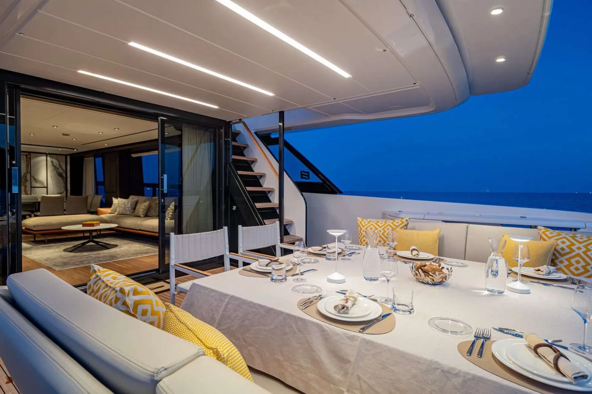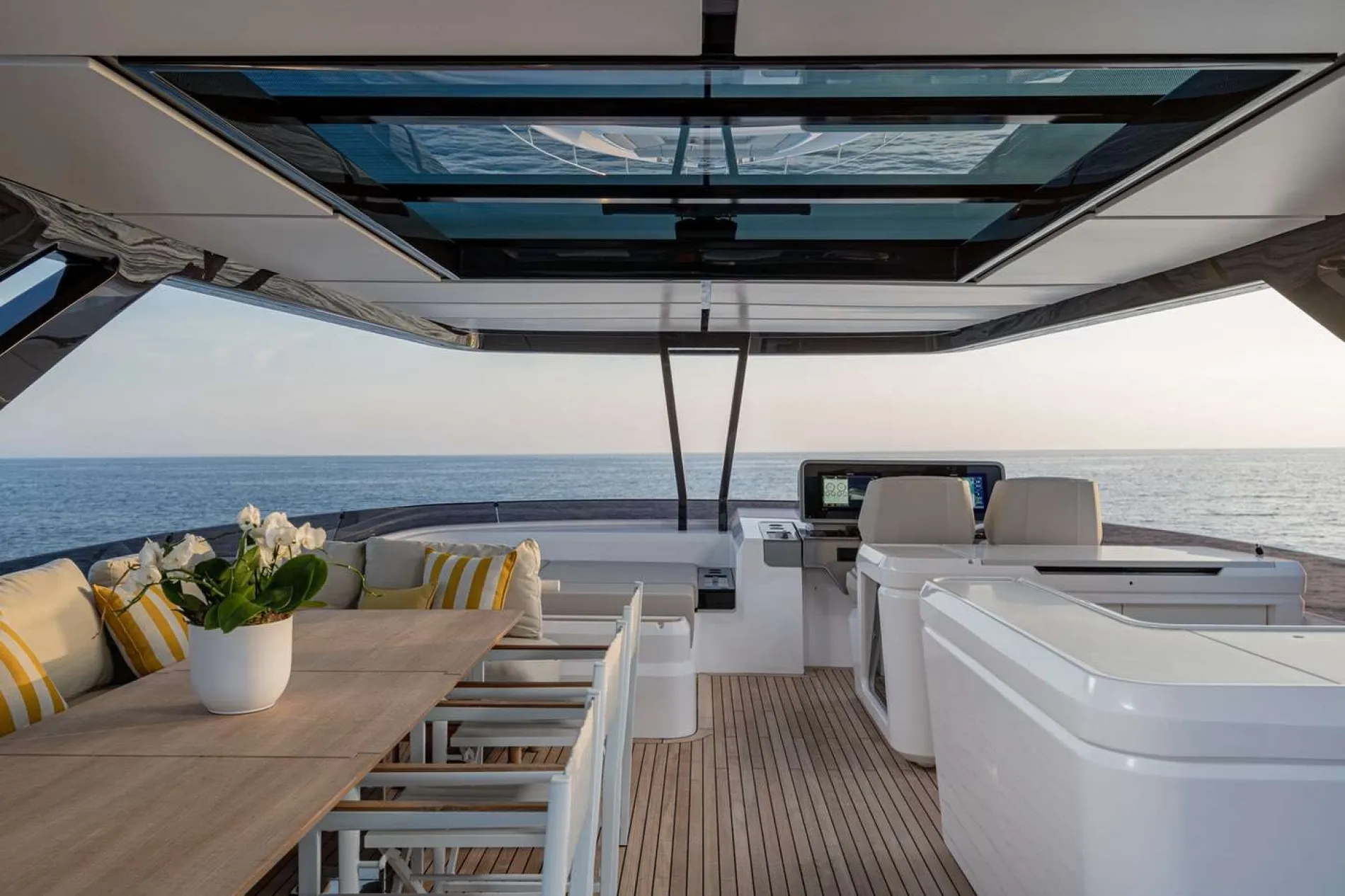The aft cockpit is arranged around a generous dining table for eight, while the glazed transom preserves the view out across the wake.