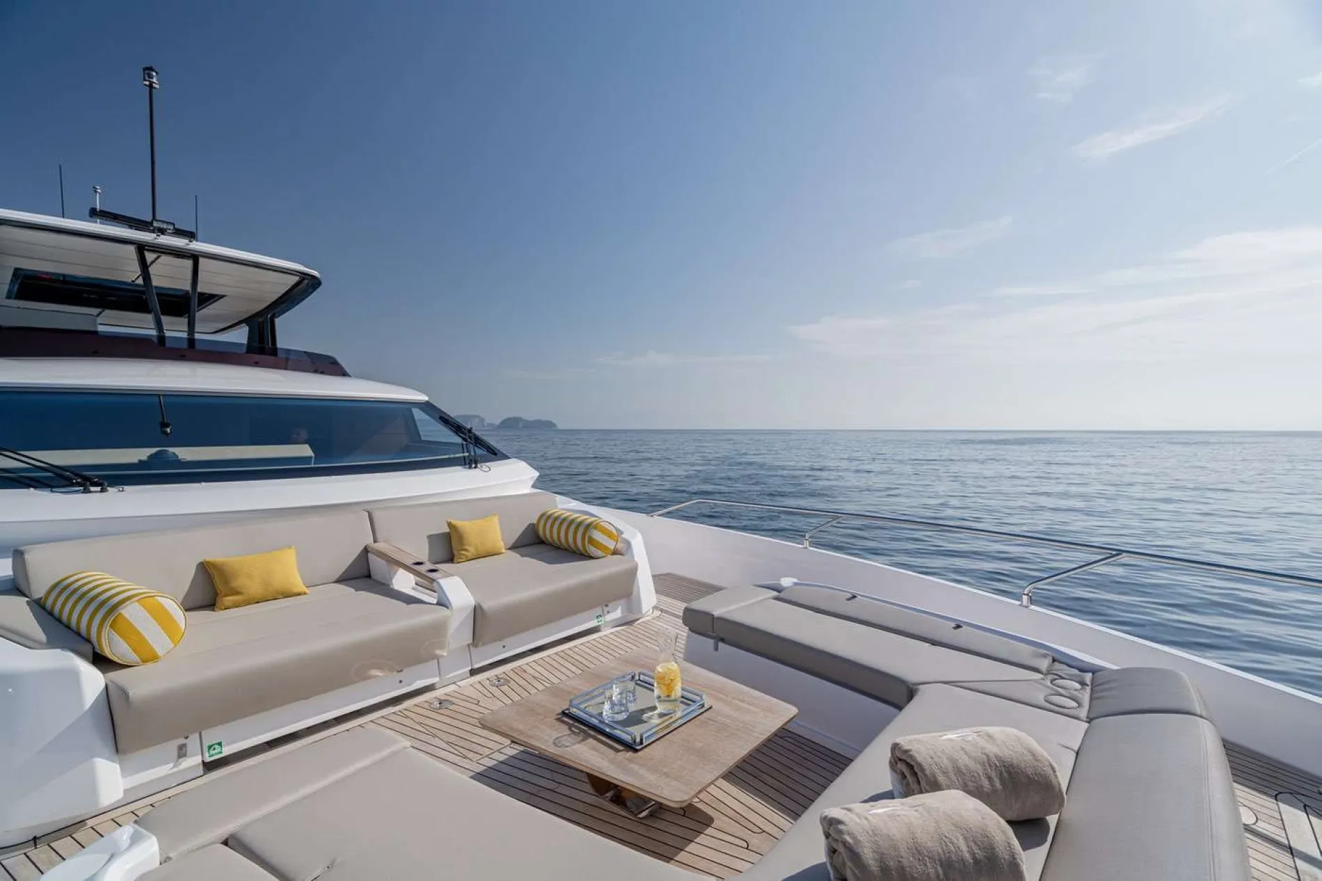Forward, the bow lounge combines sofas, a table and sunbathing space, creating a quieter area for morning coffee.