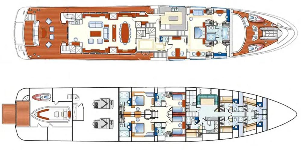 - Exceptional accommodations, including a master suite on the main deck and a VIP suite on the upper deck