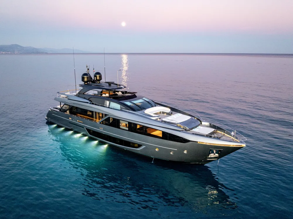 A striking Baglietto DOM115 superyacht with expansive social spaces, floor-to-ceiling glazing and refined contemporary interiors, designed for seamless indoor-outdoor living, relaxed entertaining and confident, comfortable cruising.